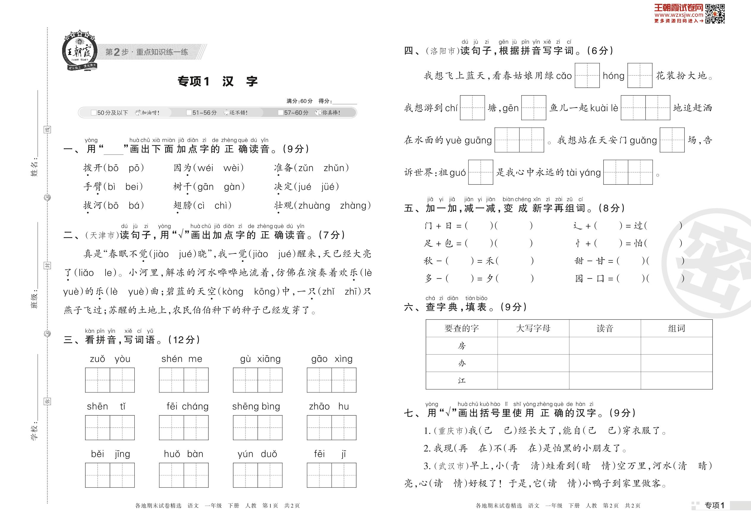 王朝霞期末专项卷——汉字一年级下册语文(人教版)【1】