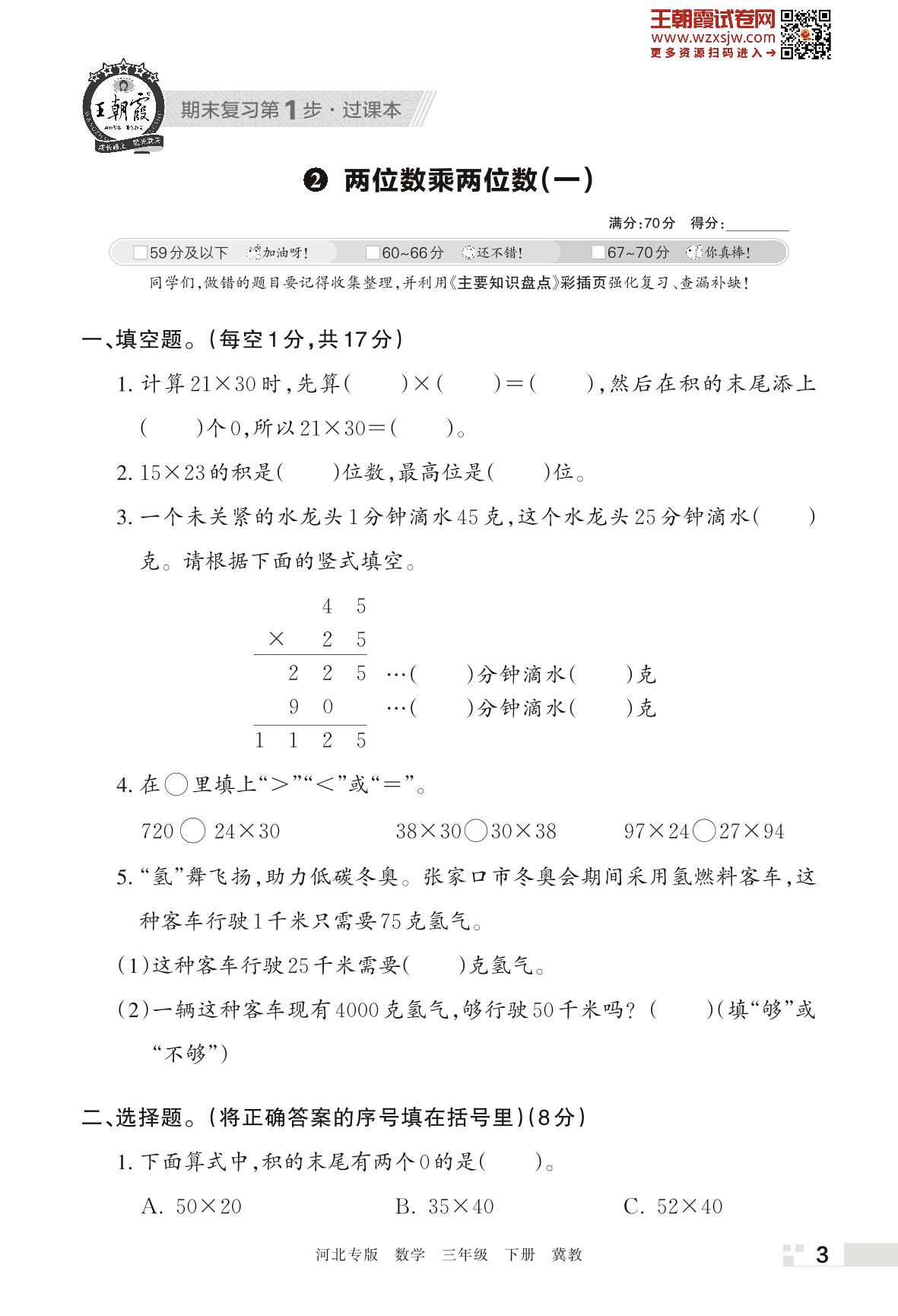 王朝霞期末过课本——2 两位数乘两位数(一)三年级下册数学(冀教版)
