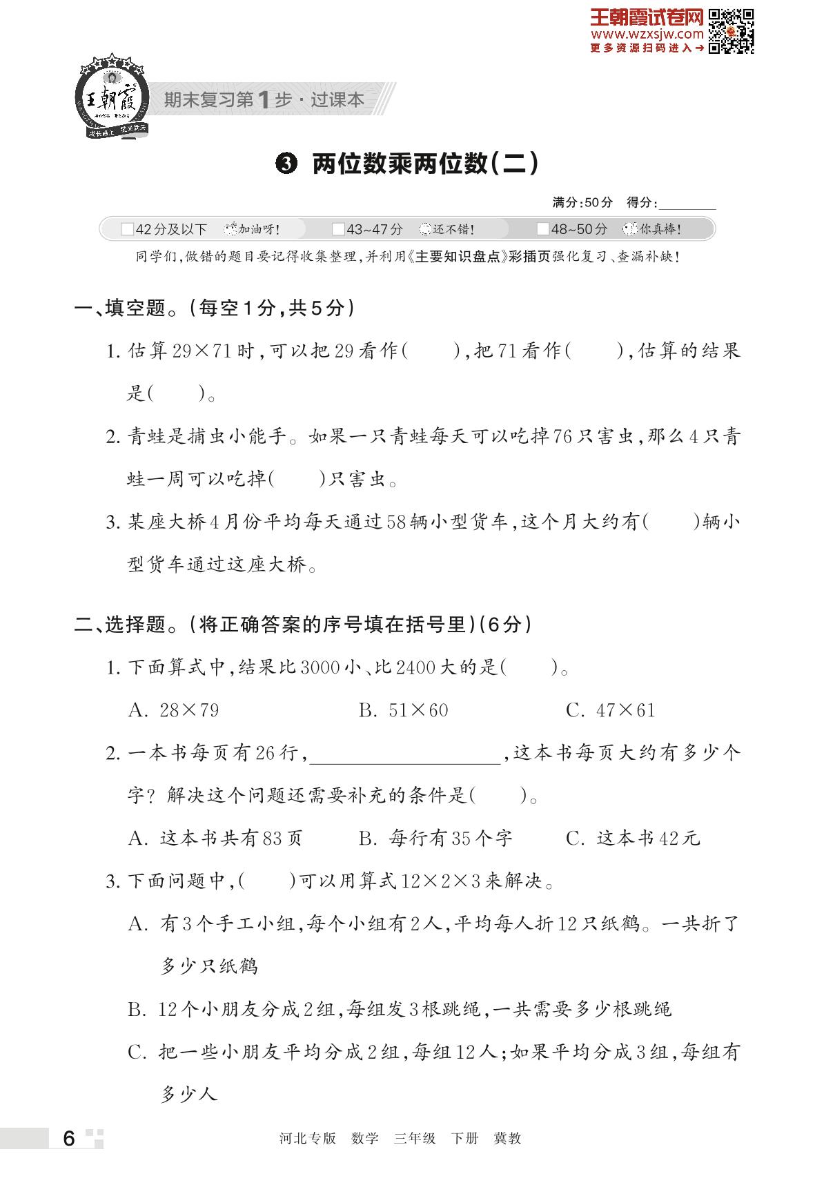 王朝霞期末过课本——3 两位数乘两位数(二)三年级下册数学(冀教版)