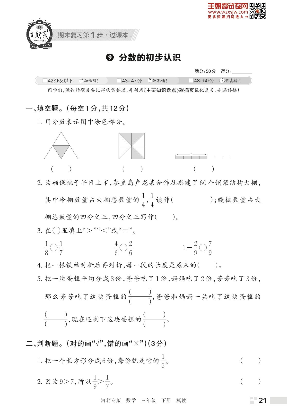 王朝霞期末过课本——9 分数的初步认识三年级下册数学(冀教版)