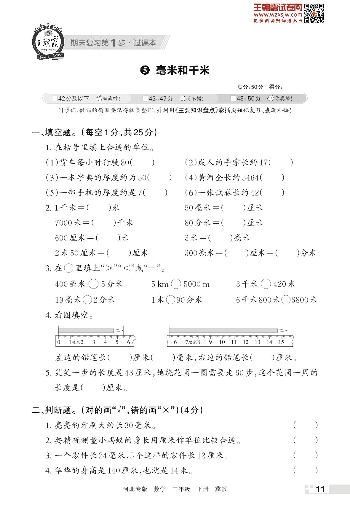 王朝霞期末过课本——5 毫米和千米三年级下册数学(冀教版)