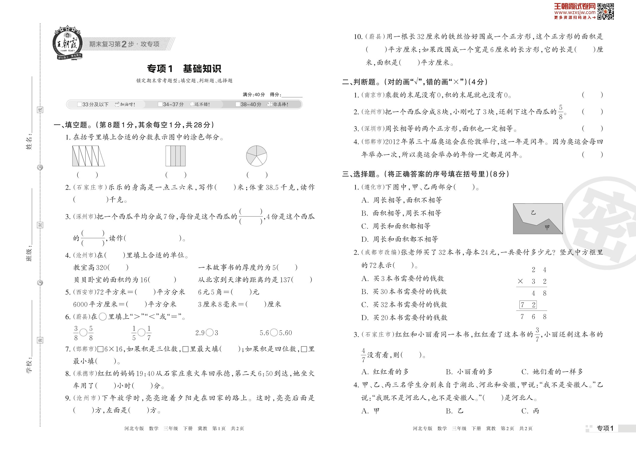 王朝霞期末专项卷——基础知识三年级下册数学(冀教版)_R230419150136607【1】