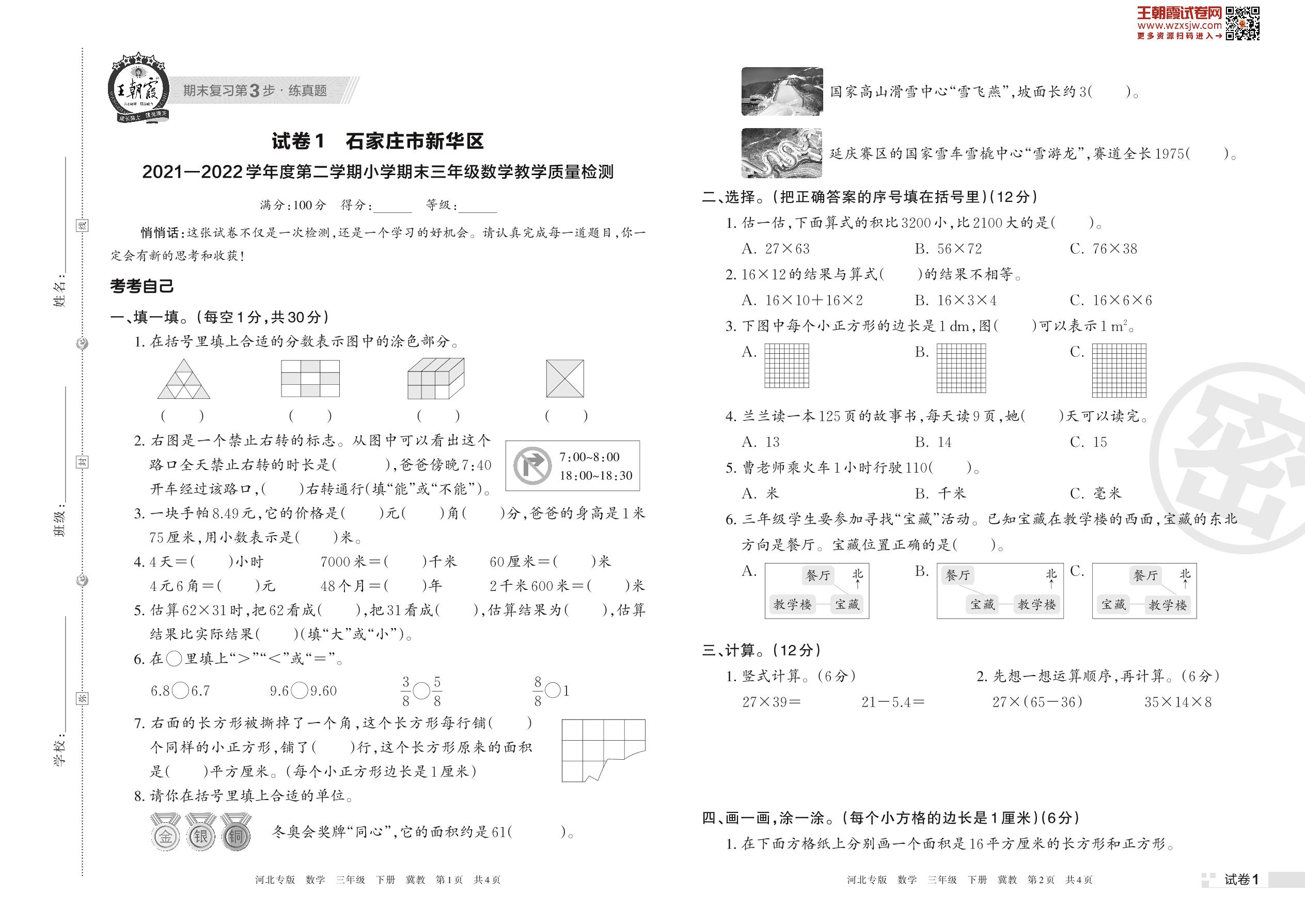 石家庄市新华区2021—2022学年度第二学期小学期末三年级数学教学质量检测(冀教版)【1】