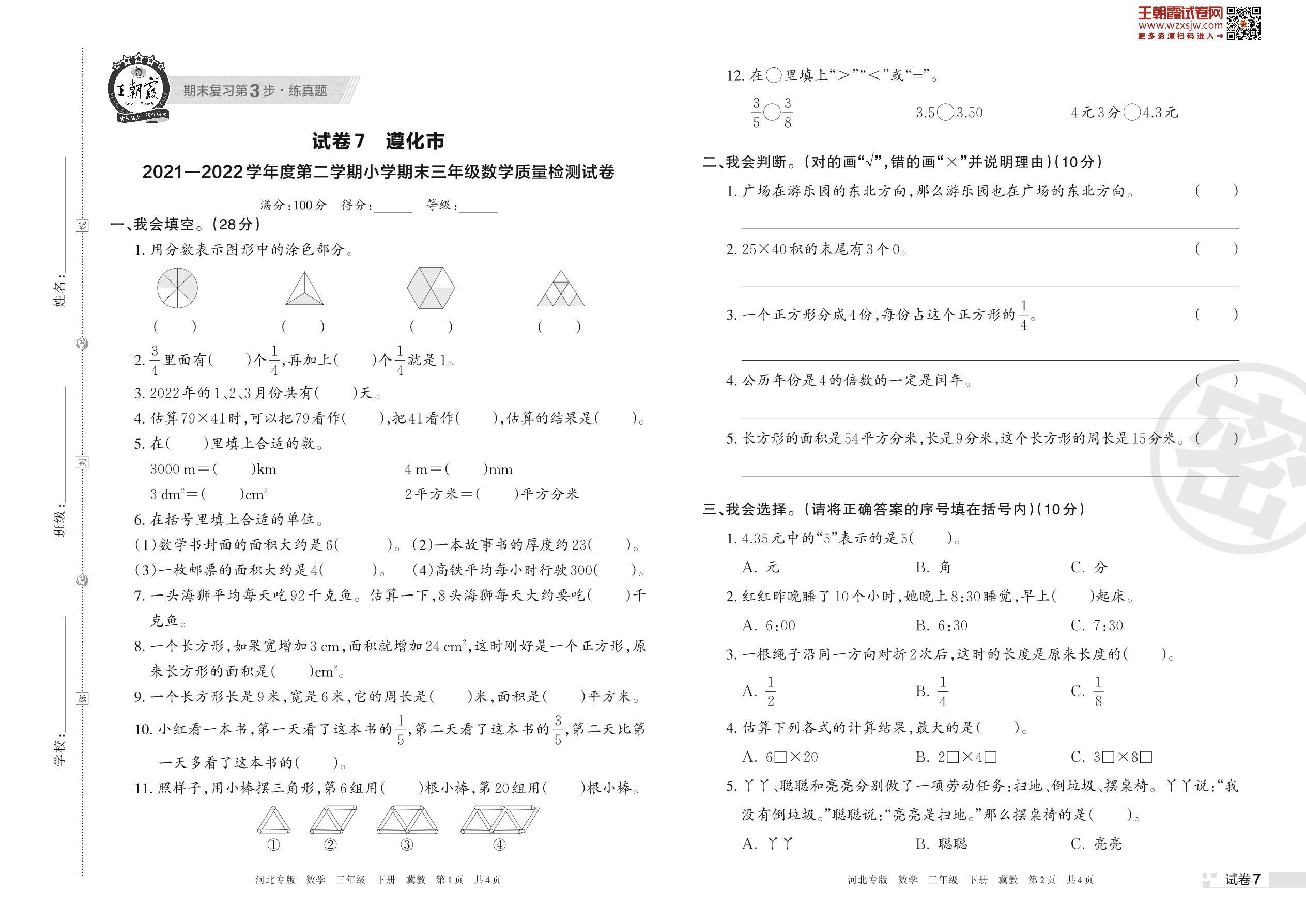 遵化市2021—2022学年度第二学期小学期末三年级数学质量检测试卷(冀教版)【7】