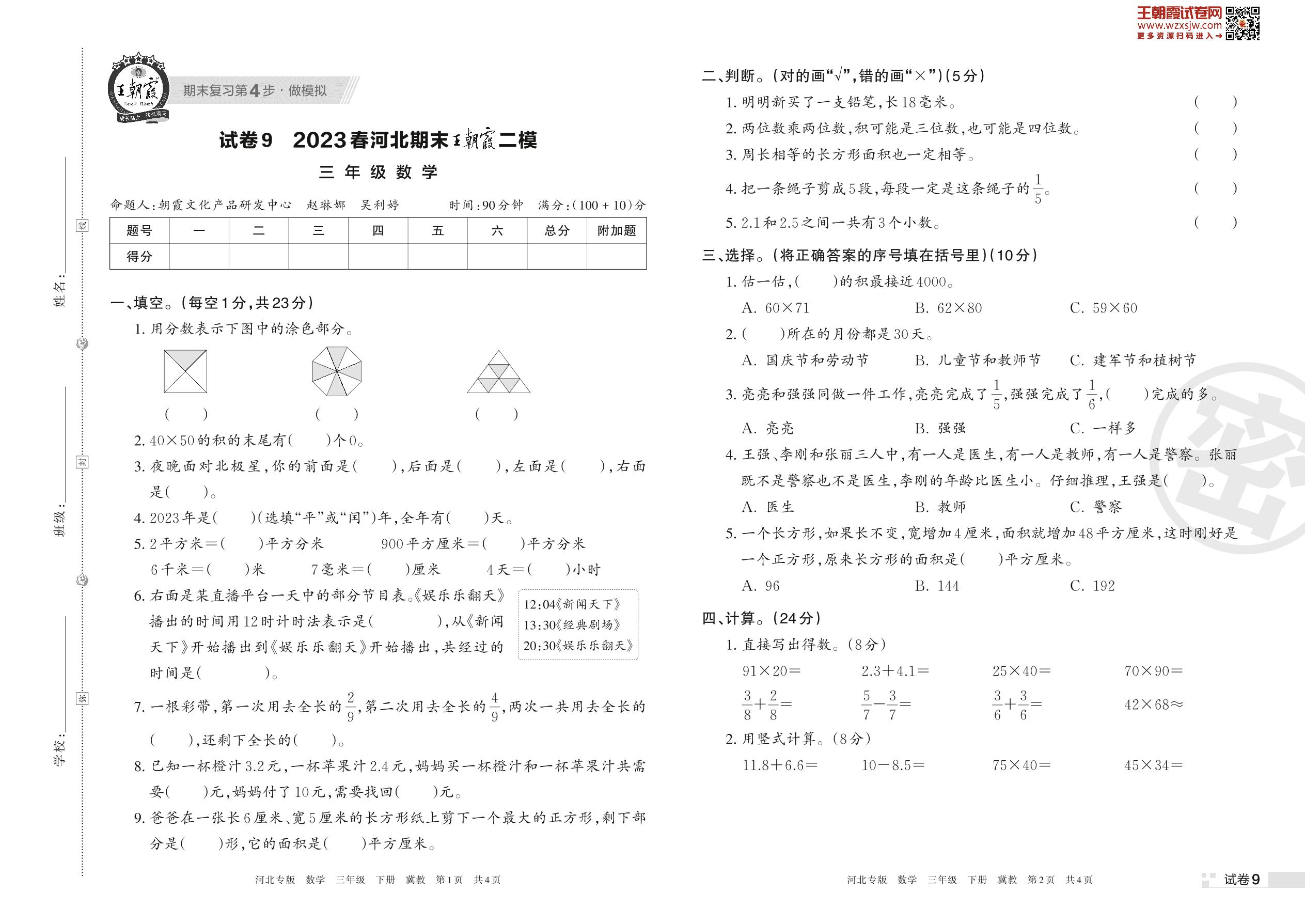 王朝霞期末模拟卷三年级下册数学(冀教版)【9】
