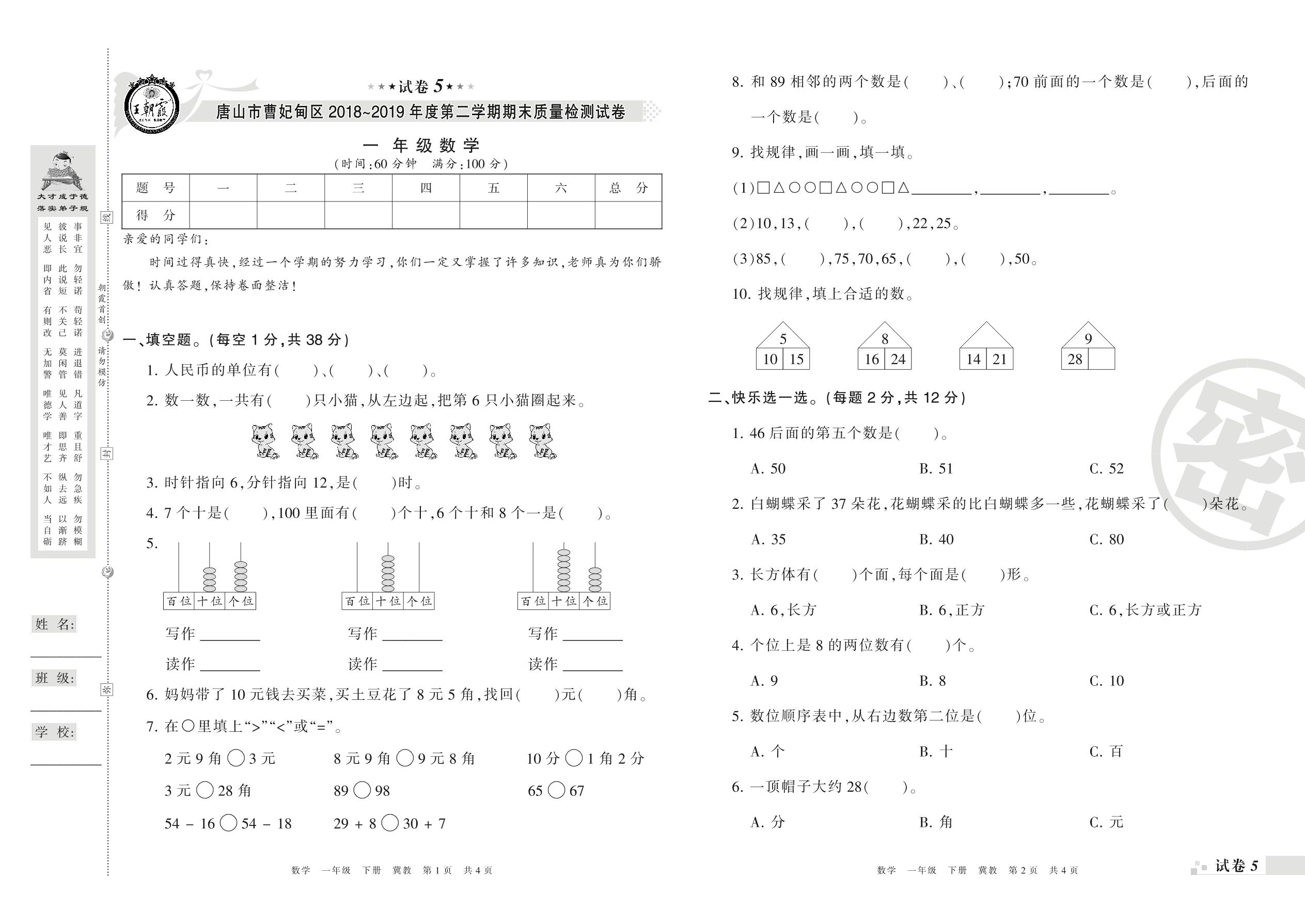 2018-2019学年第二学期唐山市曹妃甸区一年级数学试卷(冀教版)【5】