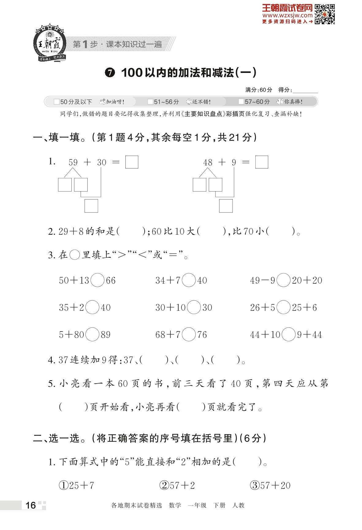 王朝霞期末过课本——7 100以内的加法和减法(一)一年级下册数学(人教版)
