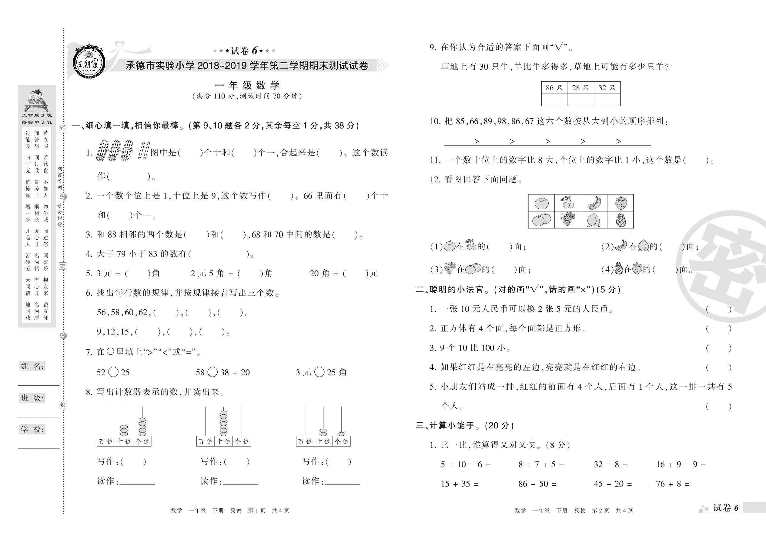 2018-2019学年第二学期承德市实验小学一年级数学试卷(冀教版)【6】