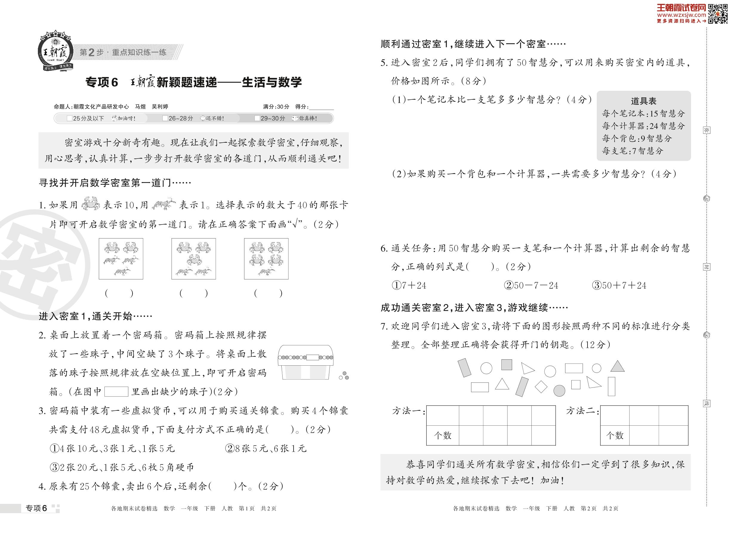 王朝霞期末专项卷——王朝霞新颖题速递:生活与数学一年级下册数学(人教版)【6】