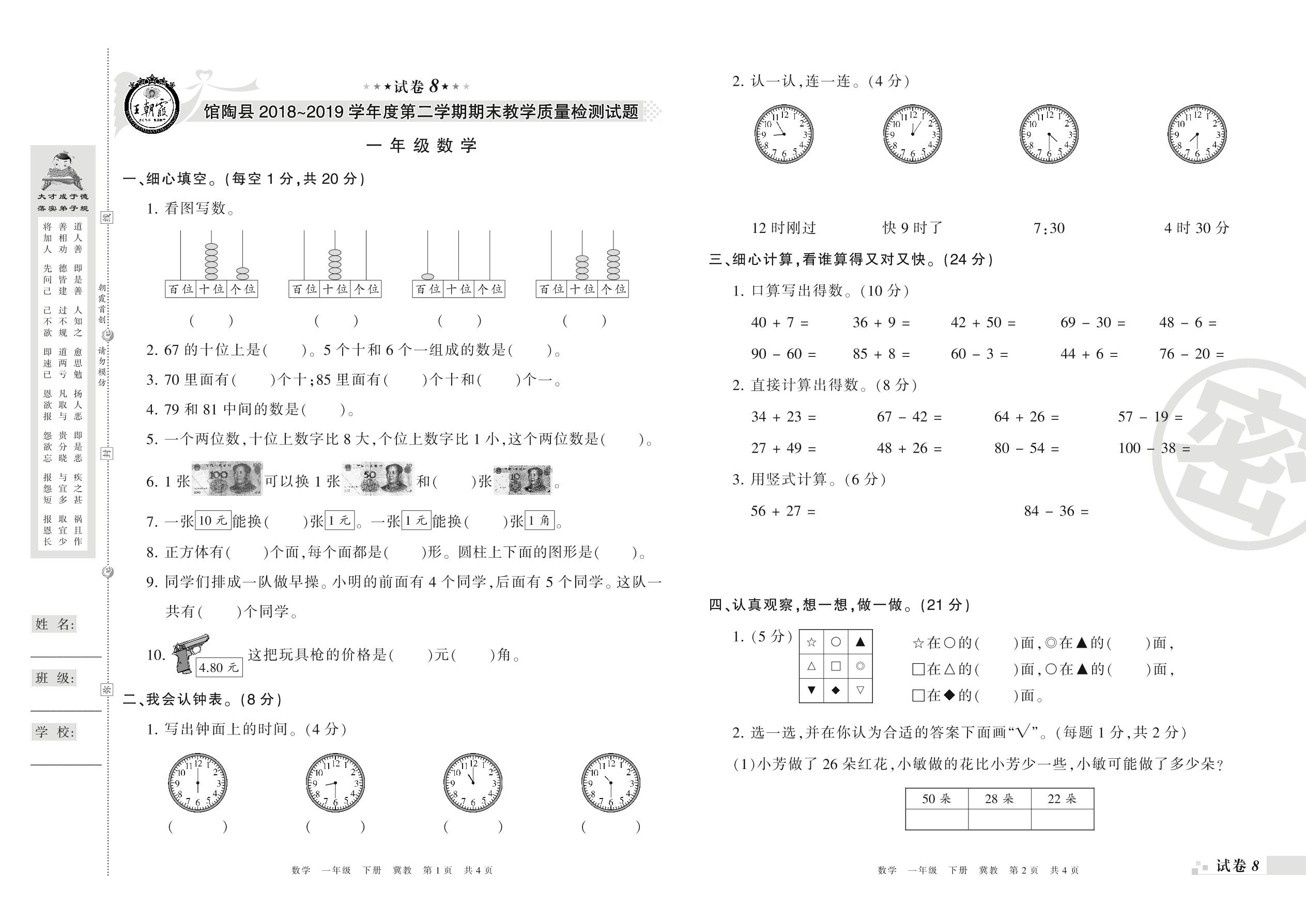 2018-2019学年第二学期邯郸市馆陶县一年级数学试卷(冀教版)【8】