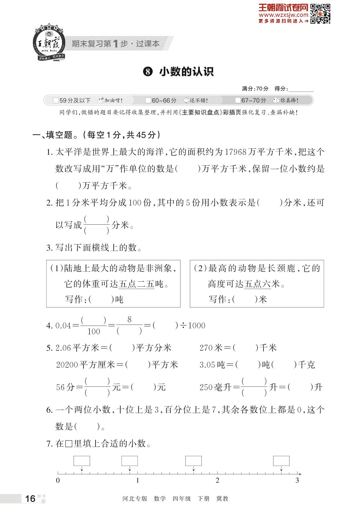 王朝霞期末过课本——8 小数的认识四年级下册数学(冀教版)
