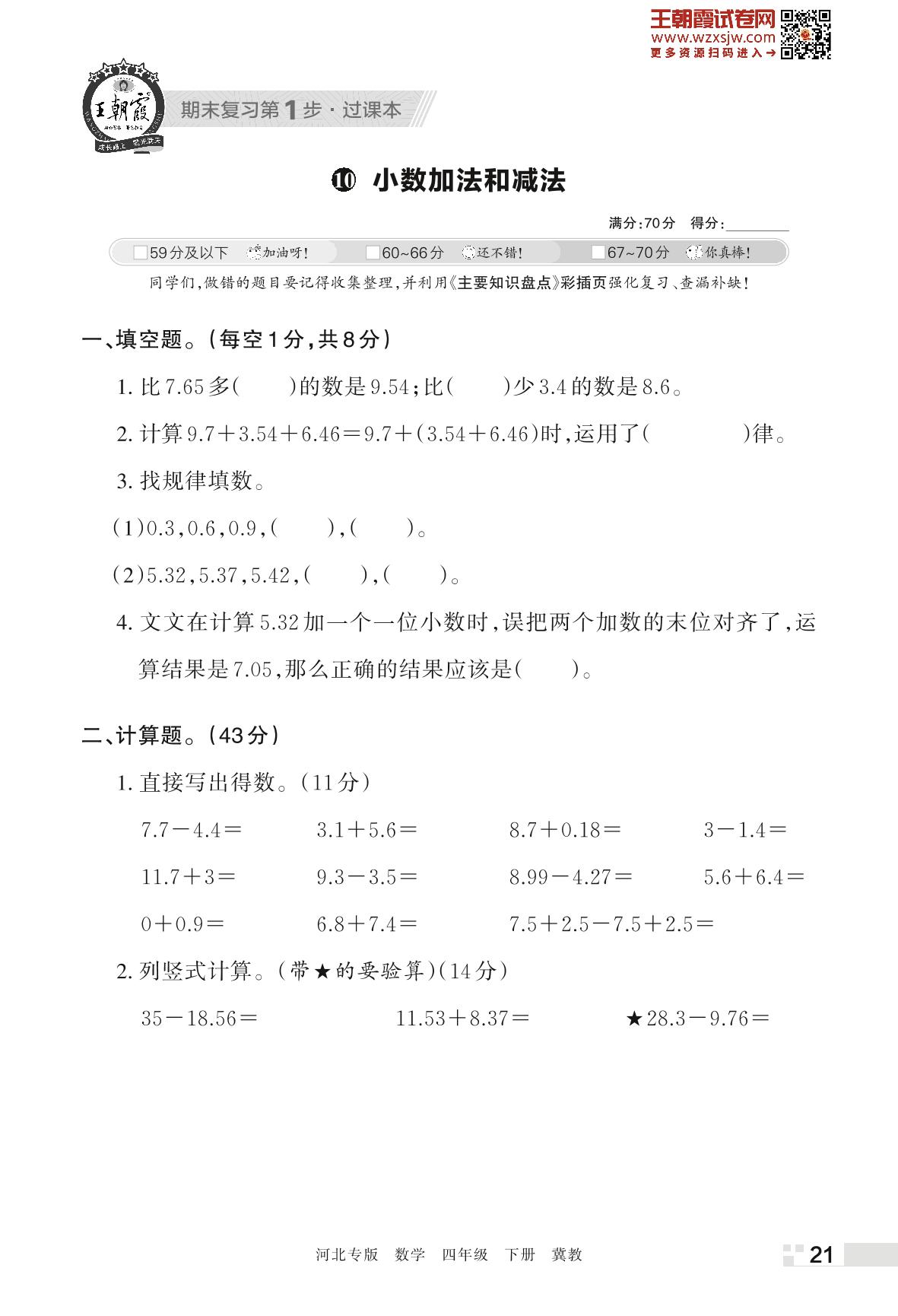 王朝霞期末过课本——10 小数加法和减法四年级下册数学(冀教版)
