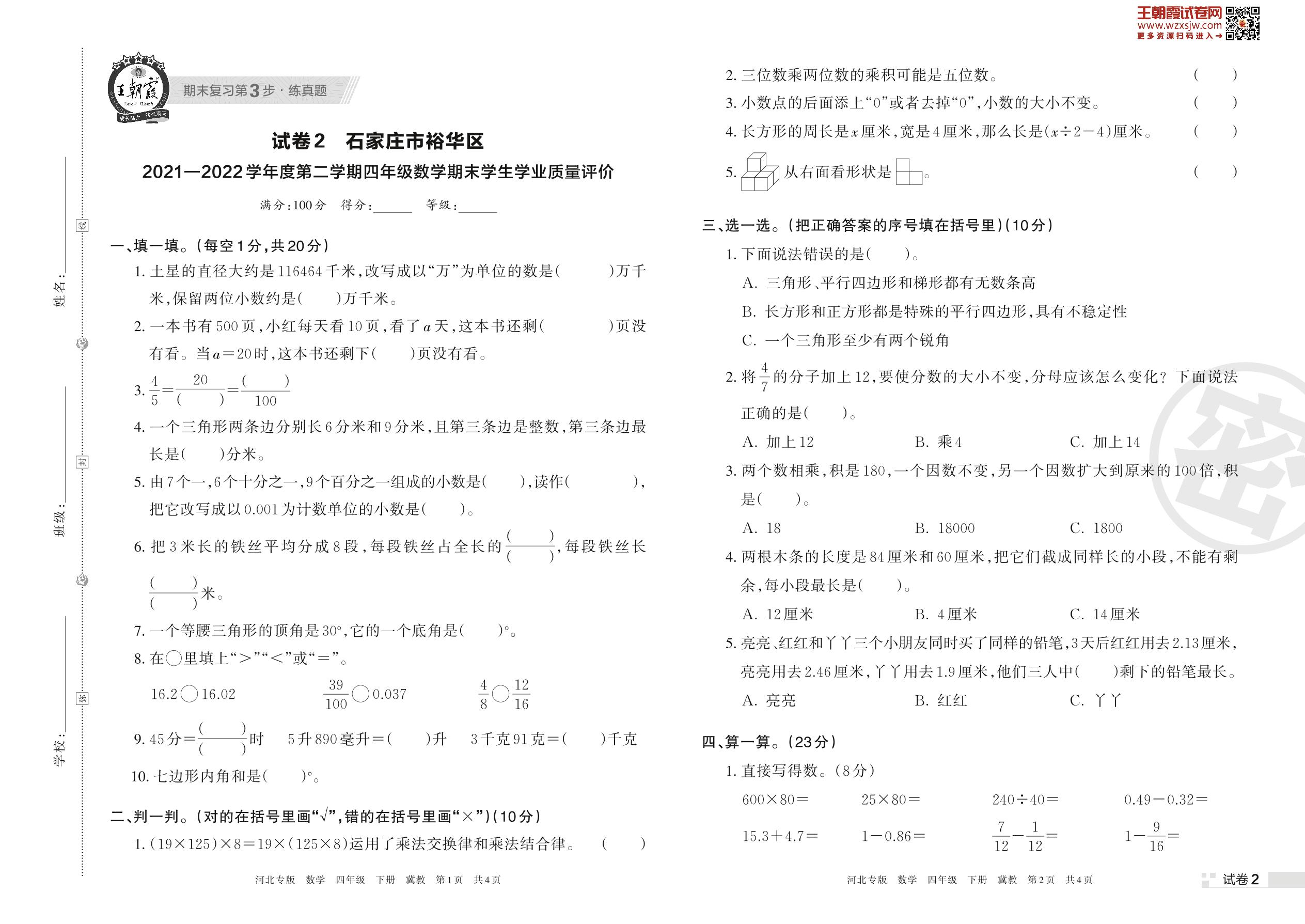 石家庄市裕华区2021—2022学年度第二学期期末四年级数学学生学业质量评价(冀教版)【2】