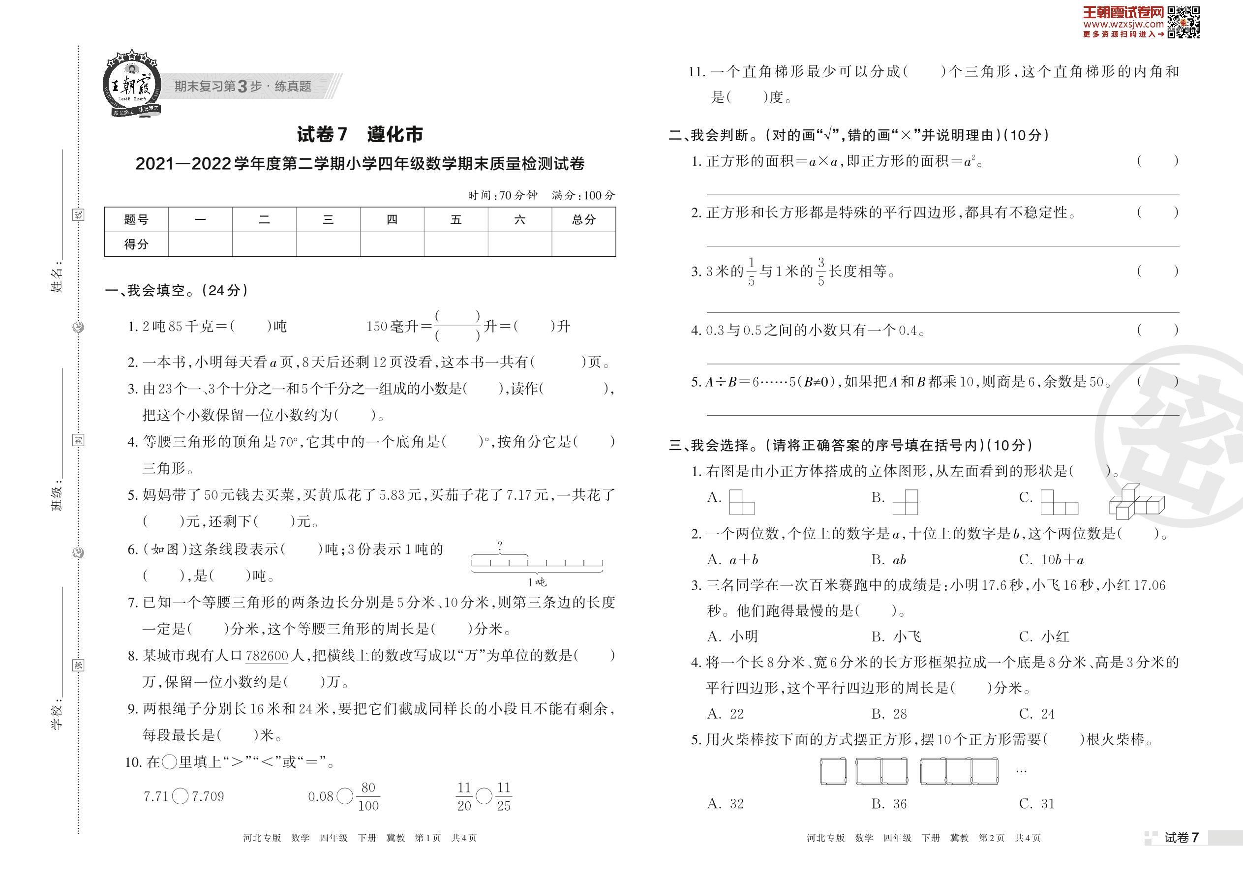遵化市2021—2022学年度第二学期小学四年级数学期末质量检测试卷(冀教版)【7】