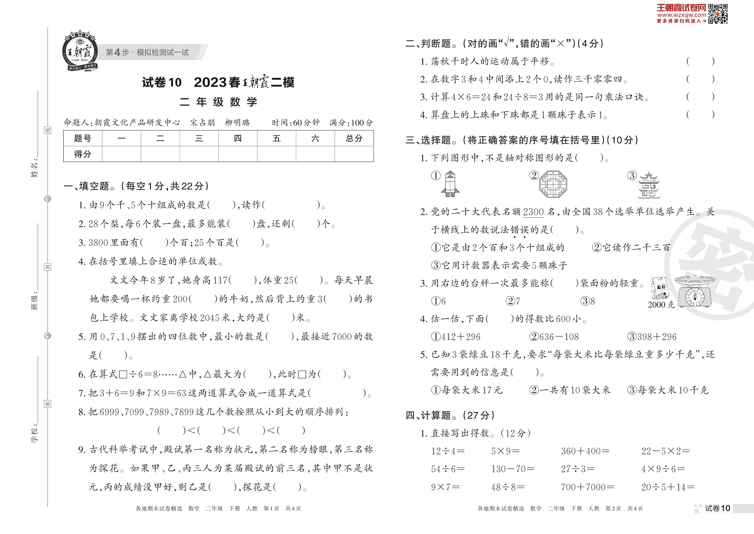 王朝霞期末模拟卷二年级下册数学(人教版)【10】