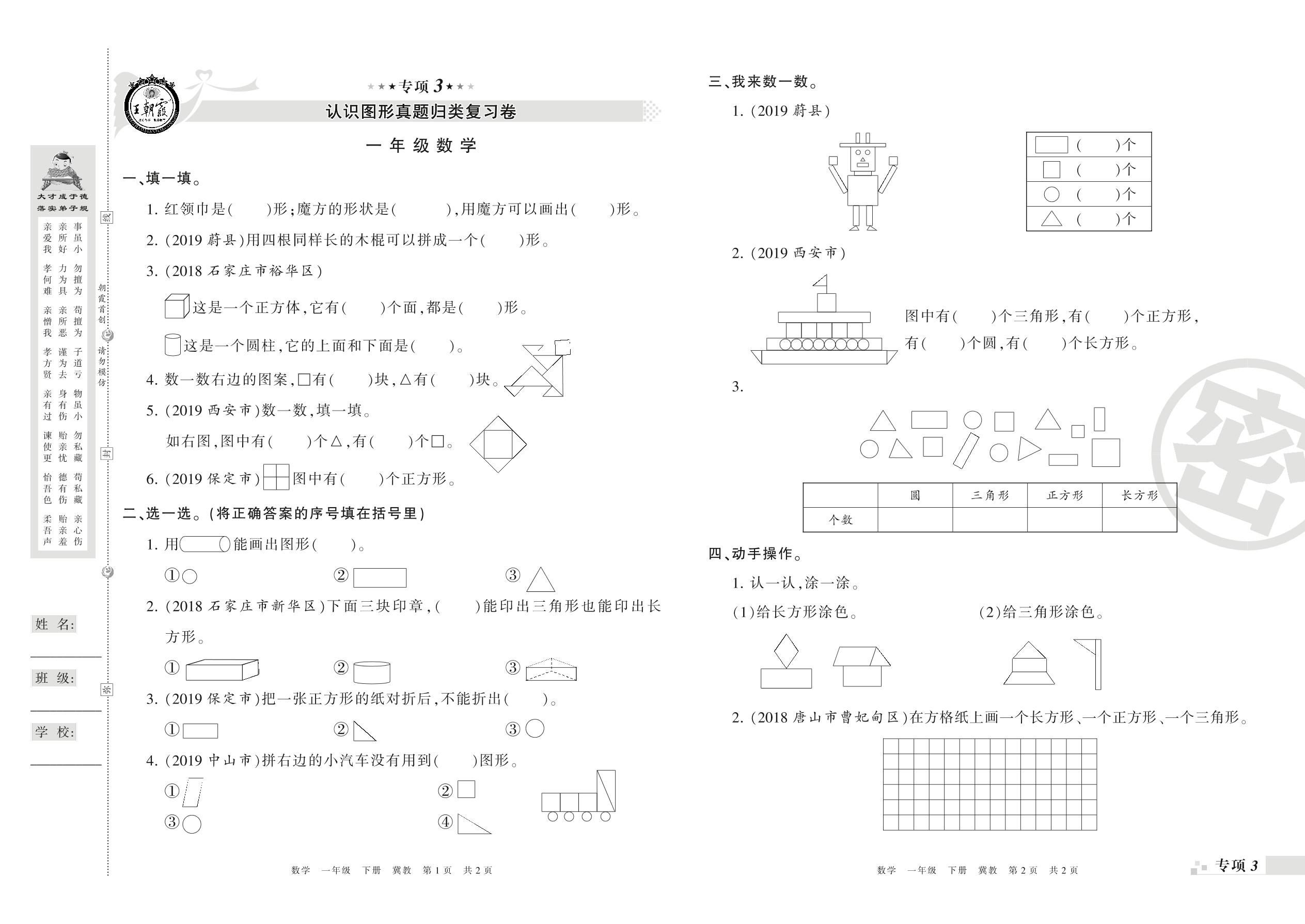 王朝霞期末专项卷——认识图形、两位数加减一位数、整十数真题归类复习卷一年级下册数学(冀教版)_R210802214103【0】