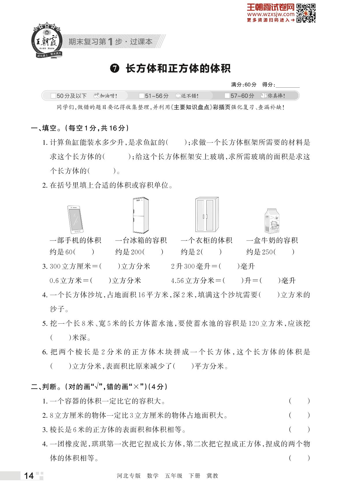 王朝霞期末过课本——7 长方体和正方体的体积五年级下册数学(冀教版)