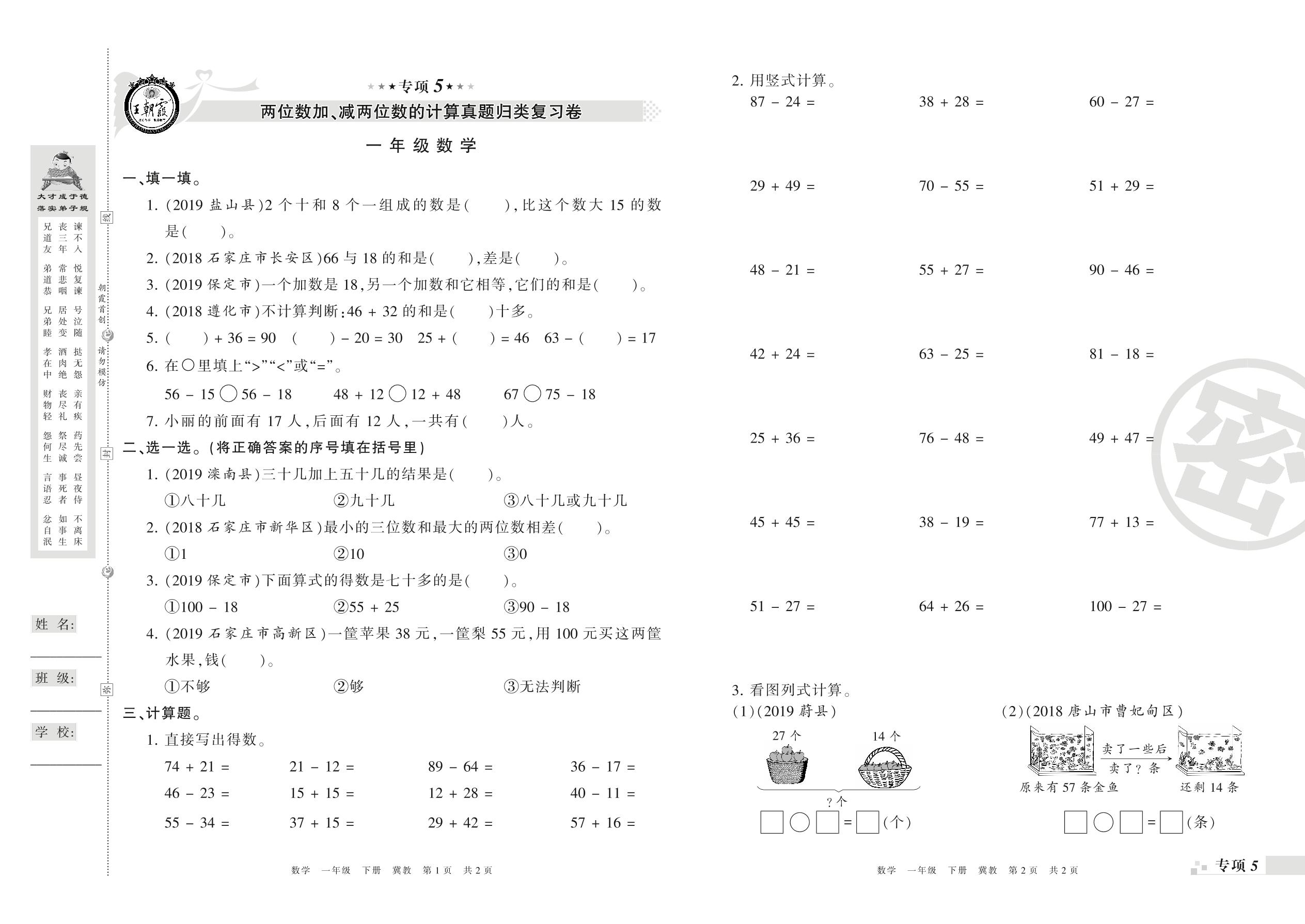 王朝霞期末专项卷——两位数加减两位数的计算、两位数加减两位数的实际应用真题归类复习卷一年级下册数学(冀教版)_R210802214105【0】