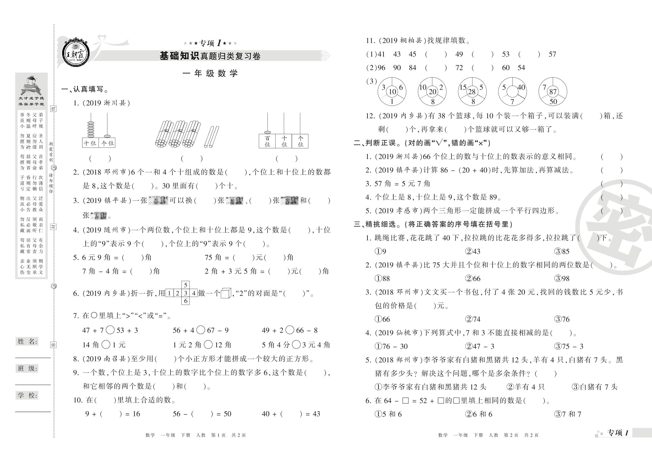 王朝霞期末专项卷——基础知识、计算真题归类复习卷一年级下册数学(人教版)_R210802214119【0】