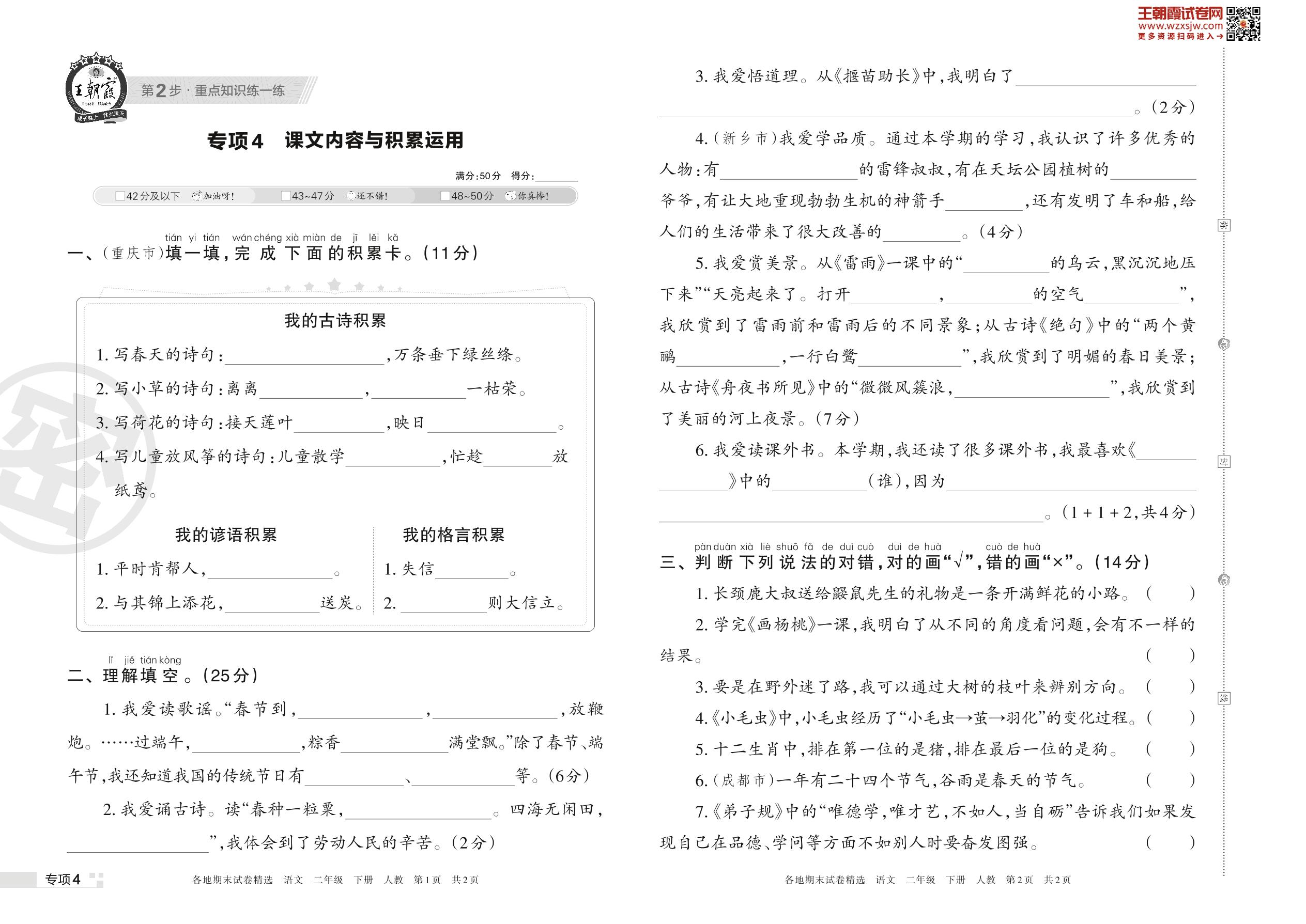 王朝霞期末专项卷——课文内容与积累运用二年级下册语文(人教版)_R230419151942564【4】