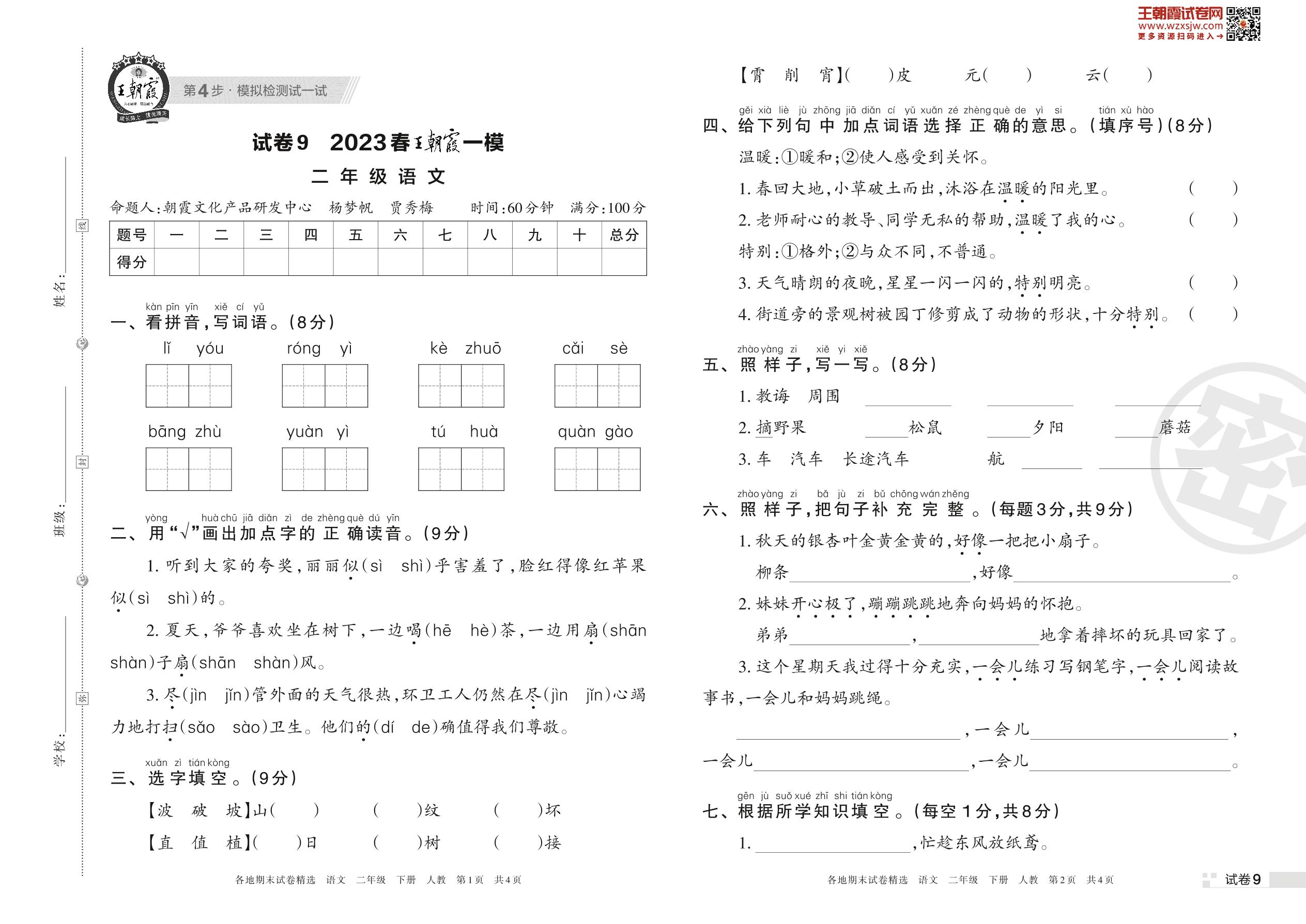王朝霞期末模拟卷二年级下册语文(人教版)【9】