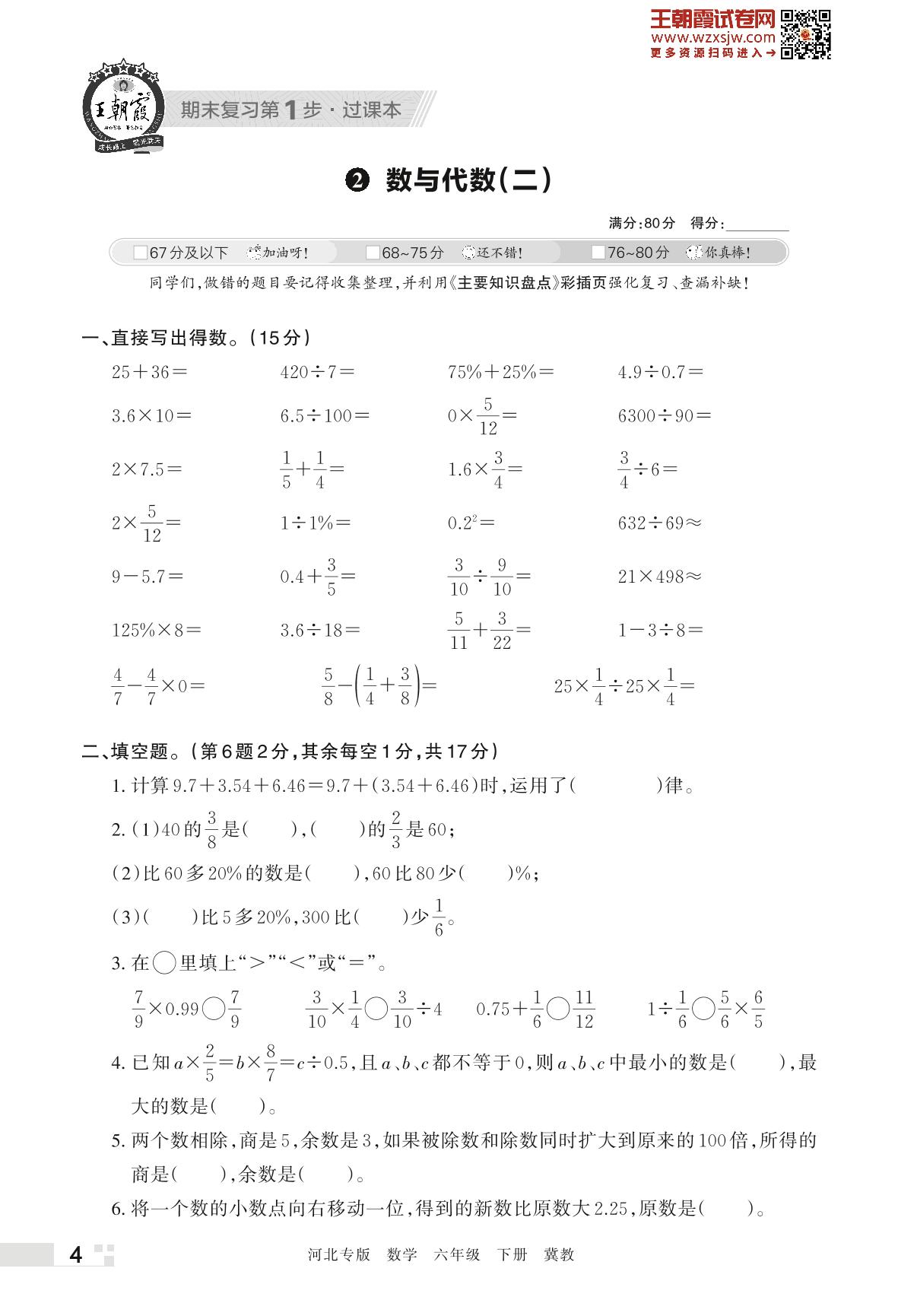 王朝霞期末过课本——2 数与代数(二)六年级下册数学(冀教版)