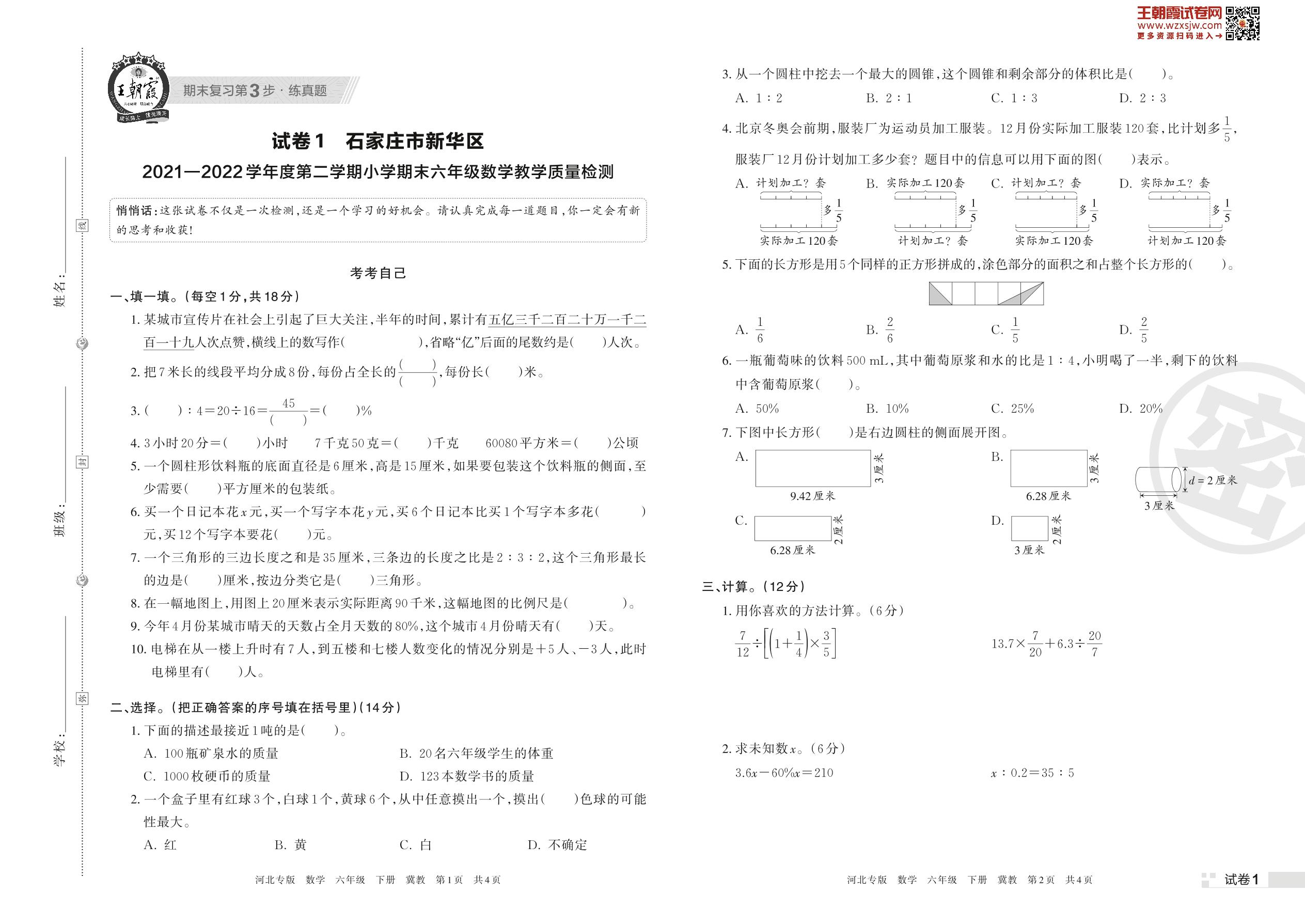 石家庄市新华区2021—2022学年度第二学期小学期末六年级数学教学质量检测(冀教版)【1】