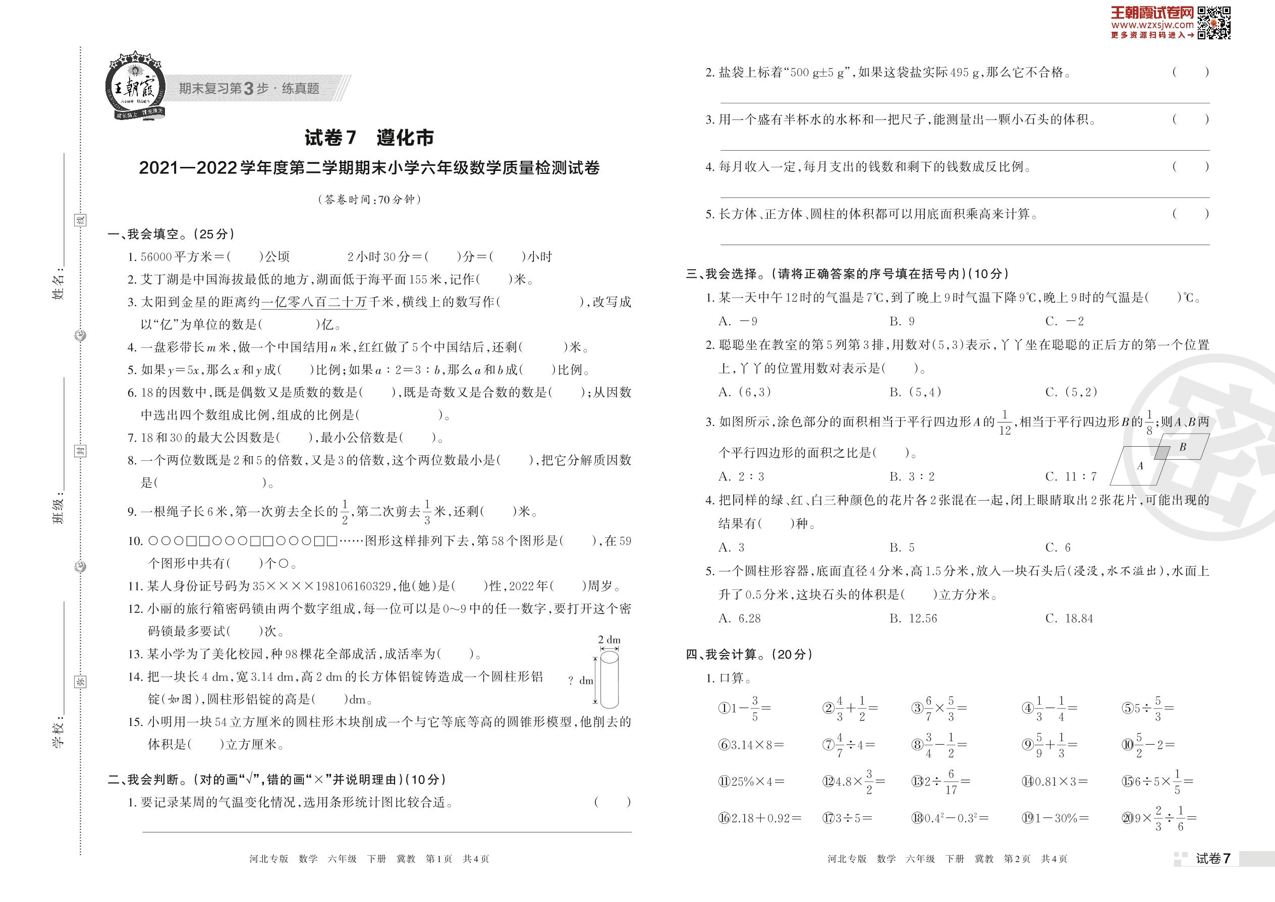 遵化市2021—2022学年度第二学期期末小学六年级数学质量检测试卷(冀教版)【7】