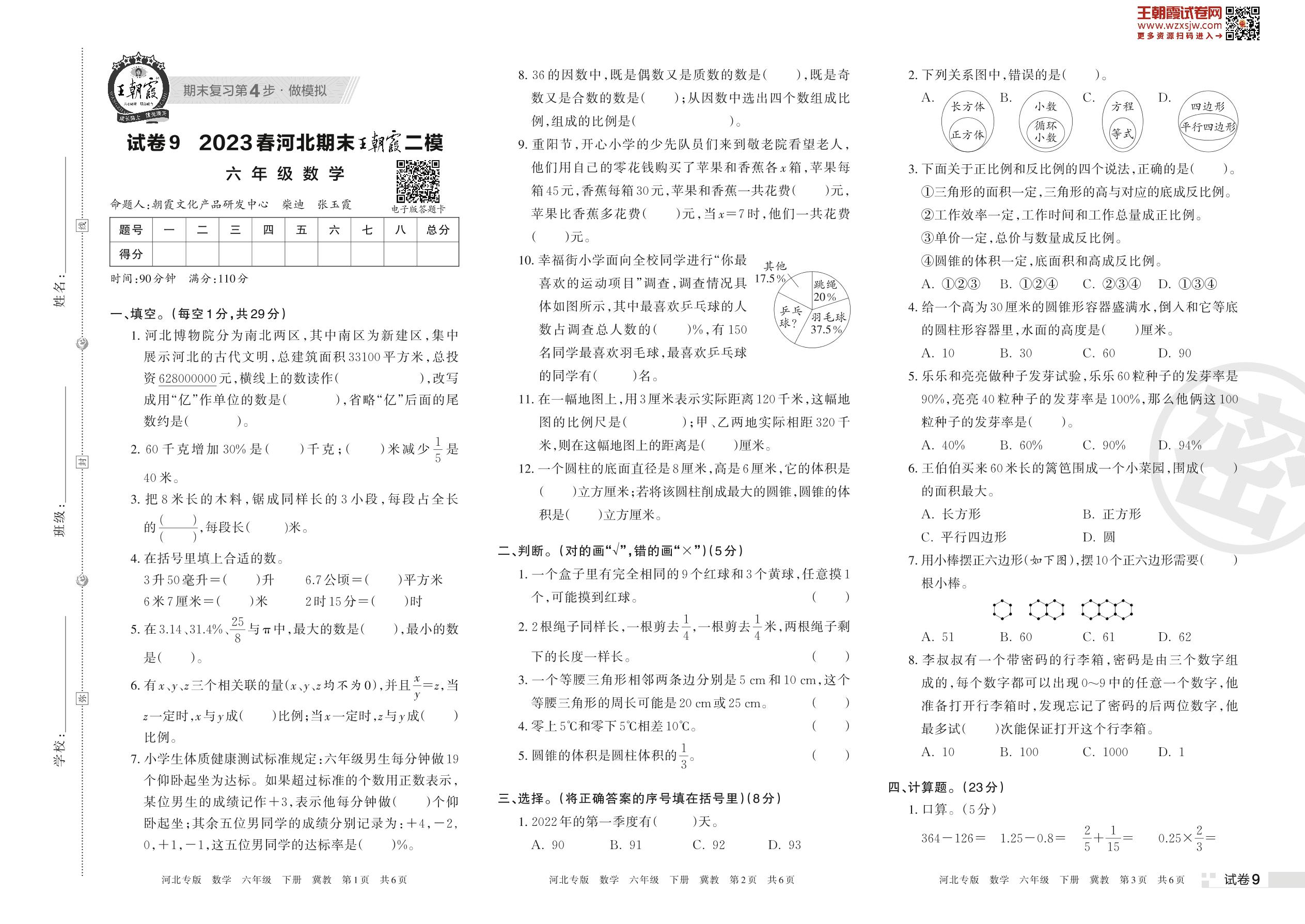 王朝霞期末模拟卷六年级下册数学(冀教版)_R230419152105293【9】