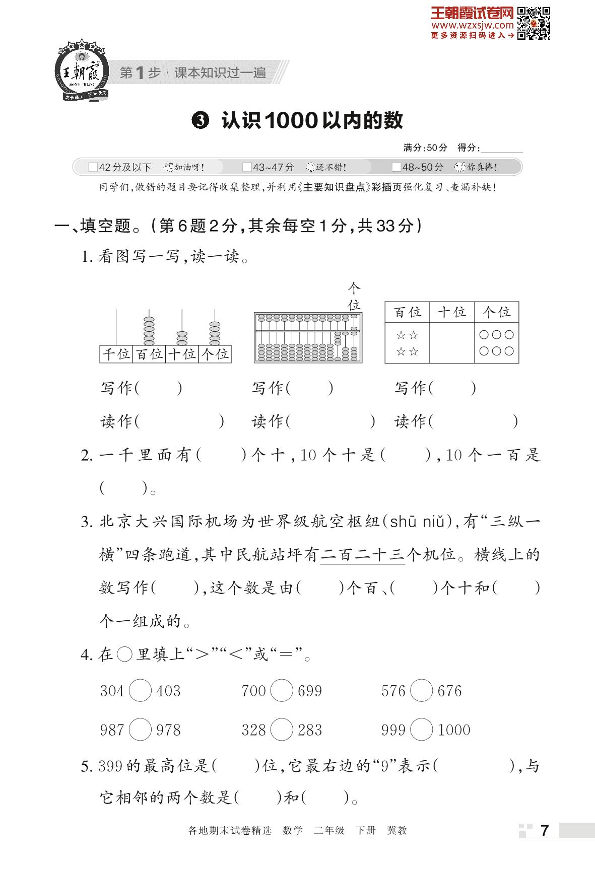 王朝霞期末过课本——3 认识1000以内的数二年级下册数学(冀教版)