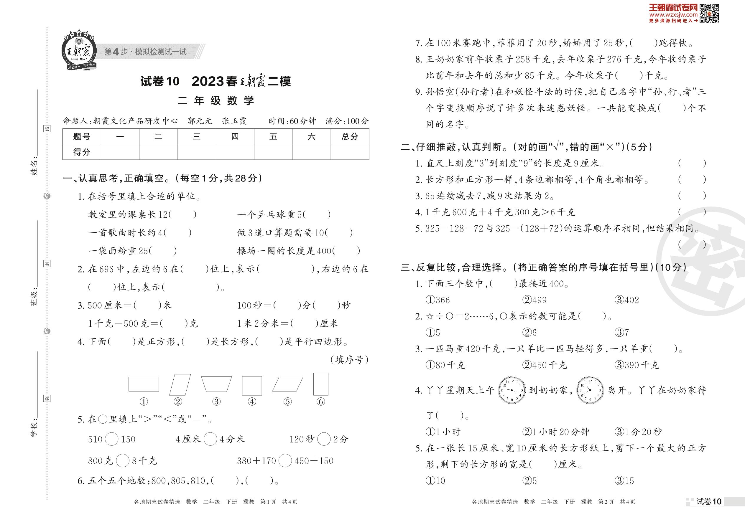 王朝霞期末模拟卷二年级下册数学(冀教版)_R230419152640343【10】