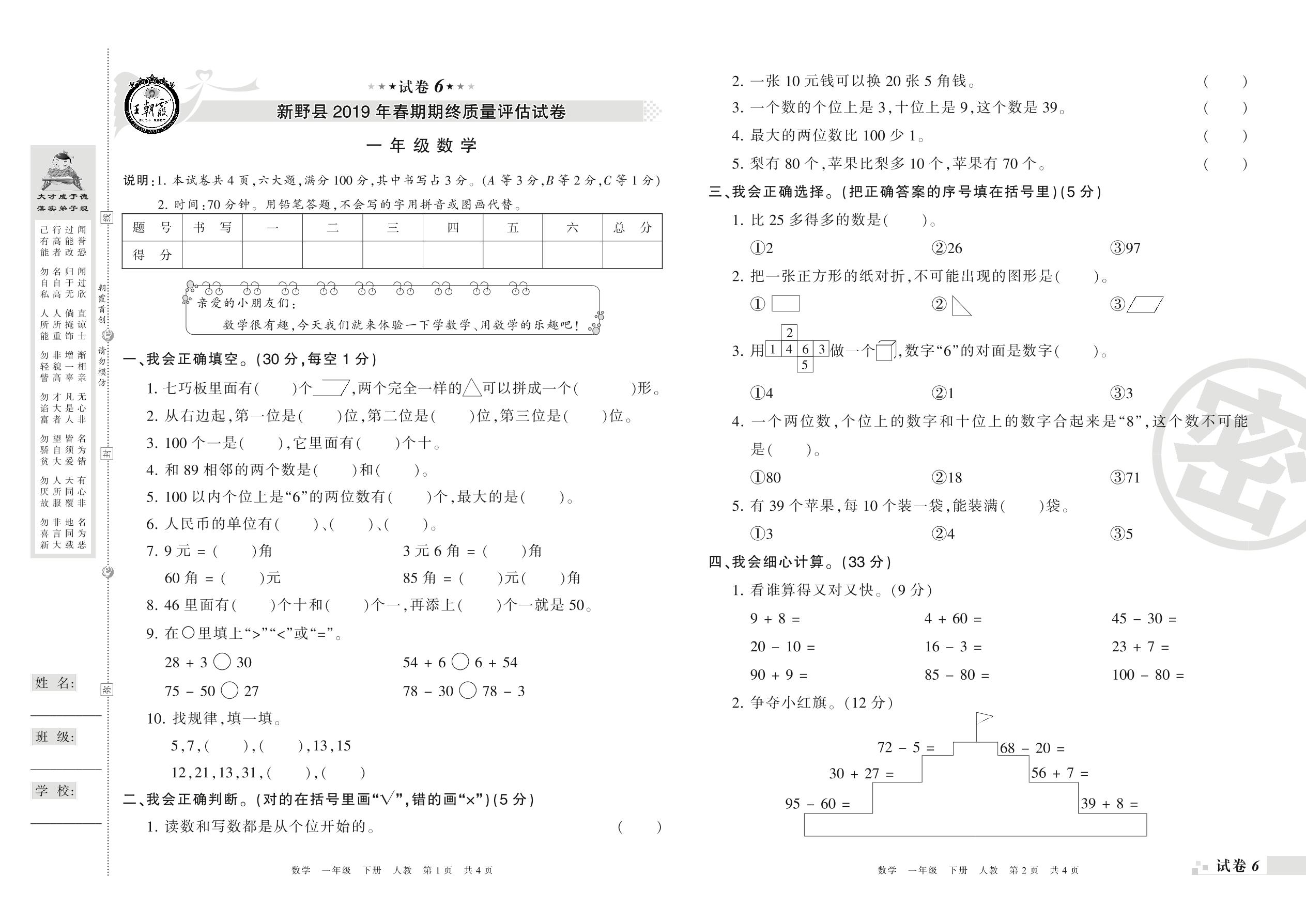 2018-2019学年第二学期南阳市新野县一年级数学试卷(人教版)【6】