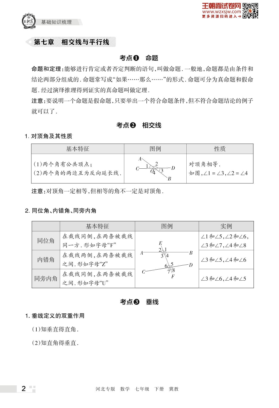 王朝霞期末知识梳理——第七章 相交线与平行线七年级下册数学(冀教版)