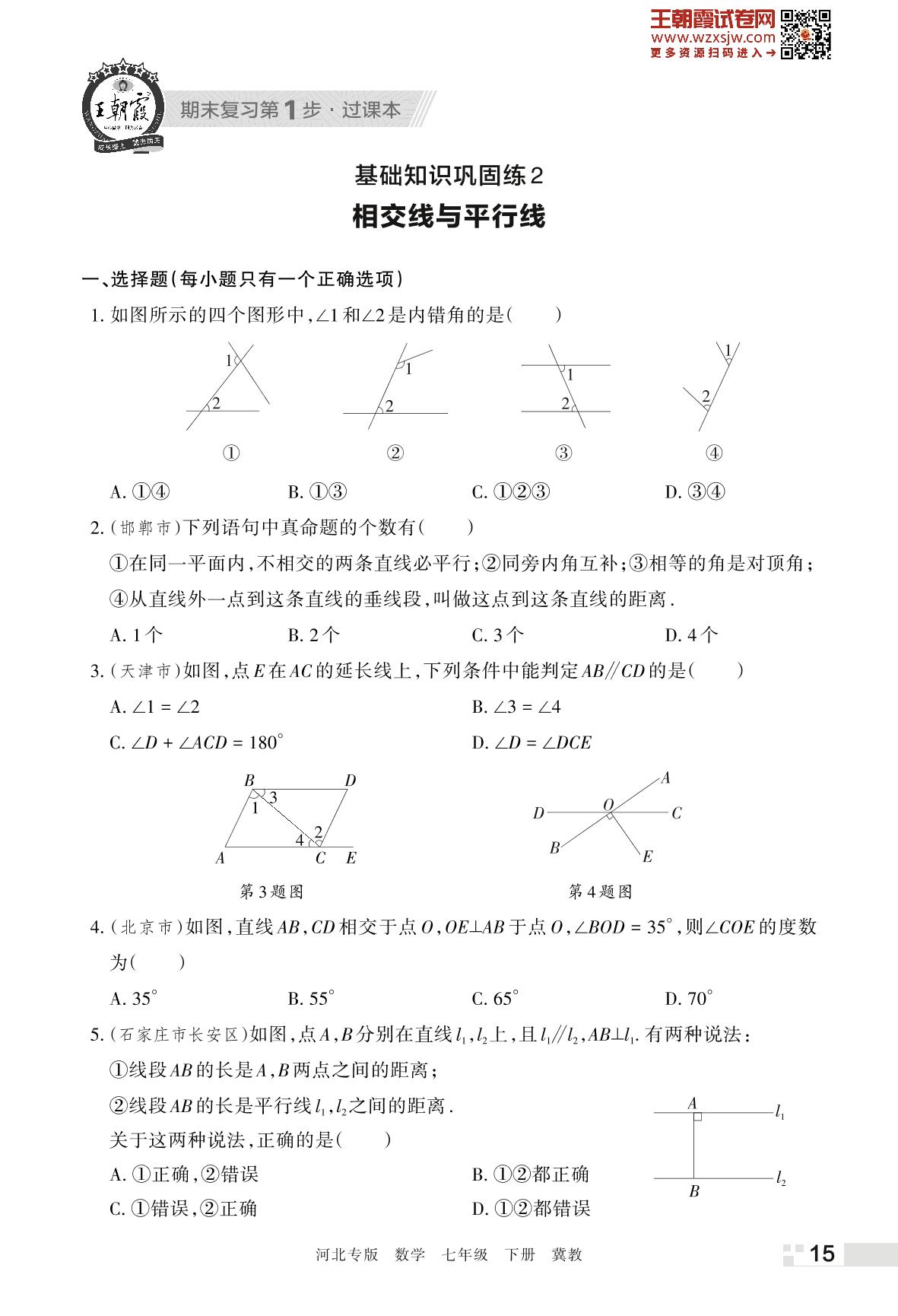 王朝霞期末过课本——基础知识巩固练2 相交线与平行线七年级下册数学(冀教版)_R230419152730072