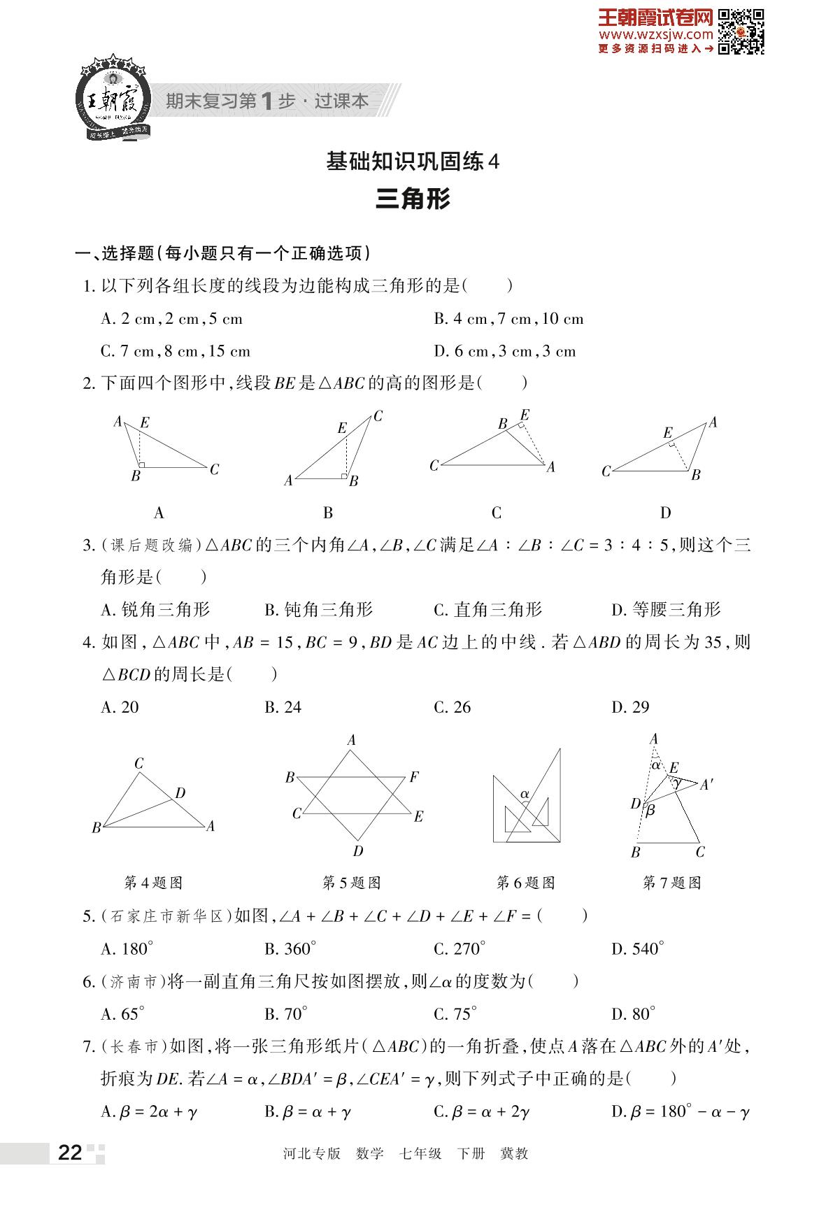 王朝霞期末过课本——基础知识巩固练4 三角形七年级下册数学(冀教版)_R230419152730385