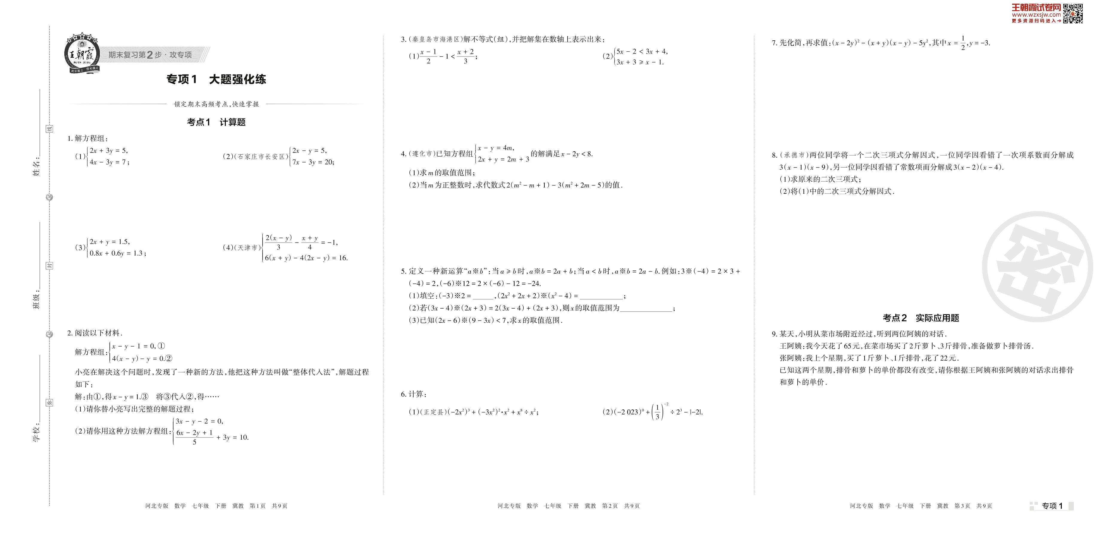 王朝霞期末专项卷——大题强化练七年级下册数学(冀教版)【1】