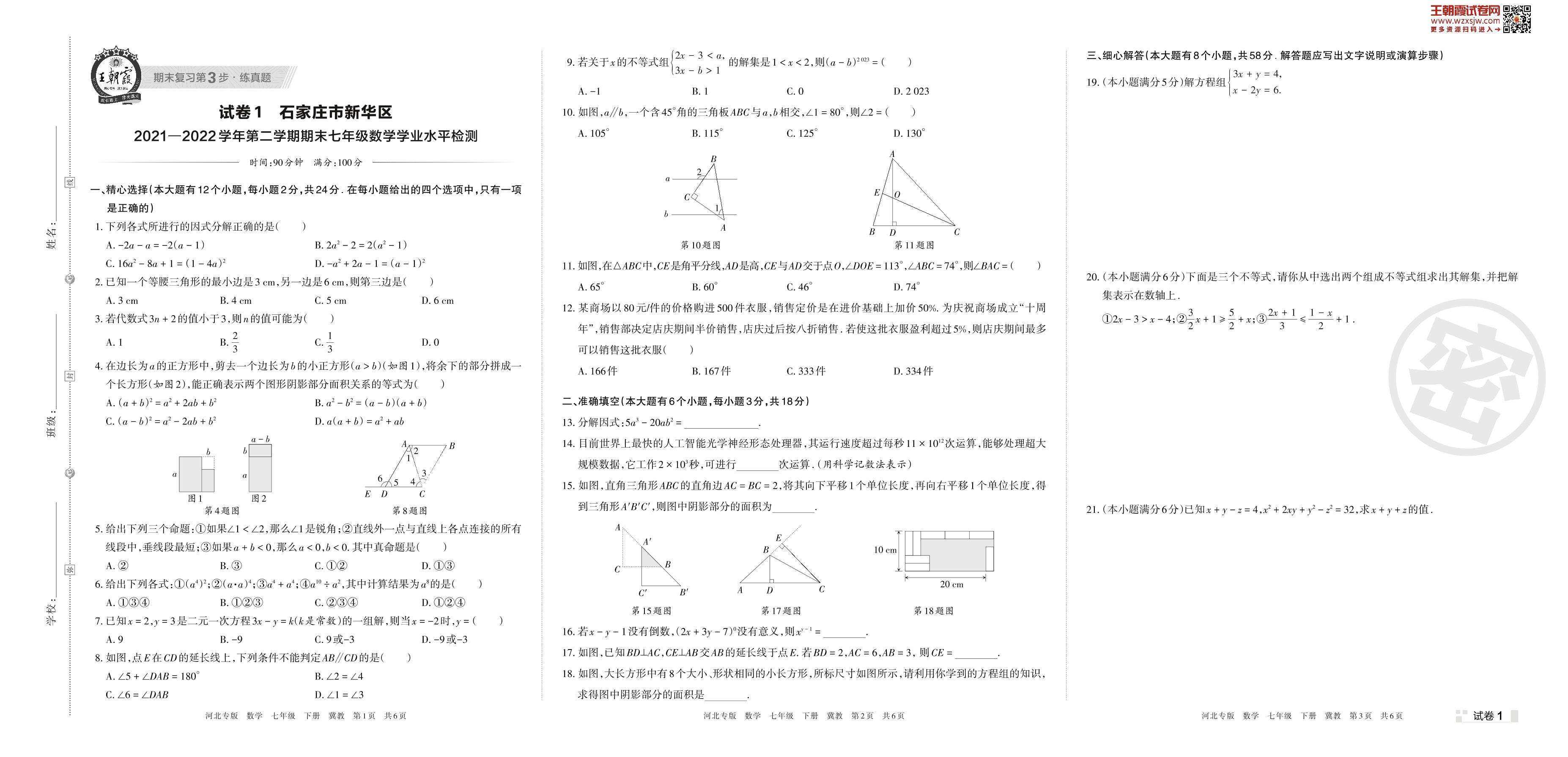 石家庄市新华区2021—2022学年第二学期期末七年级数学学业水平检测(冀教版)【1】
