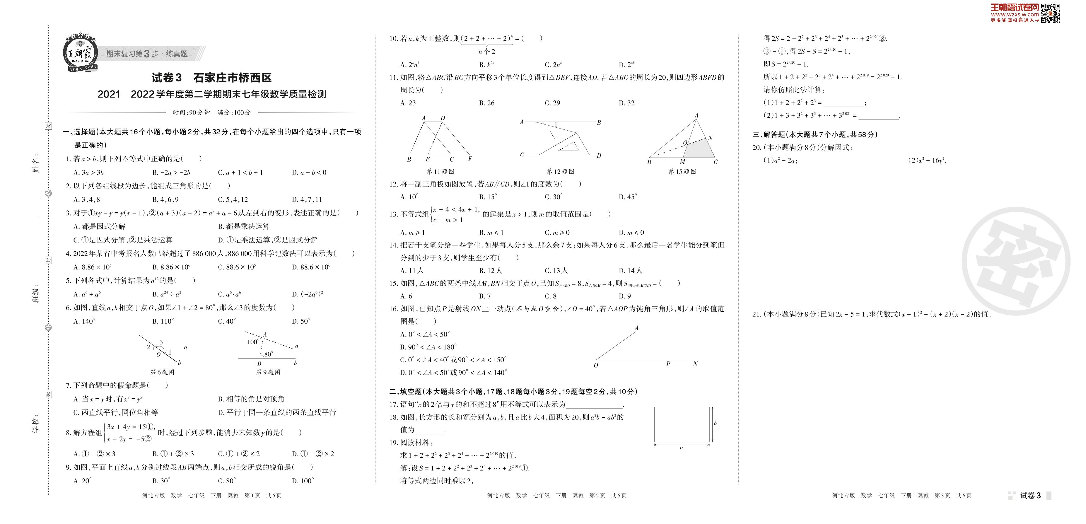 石家庄市桥西区2021—2022学年度第二学期期末七年级数学质量检测(冀教版)【3】