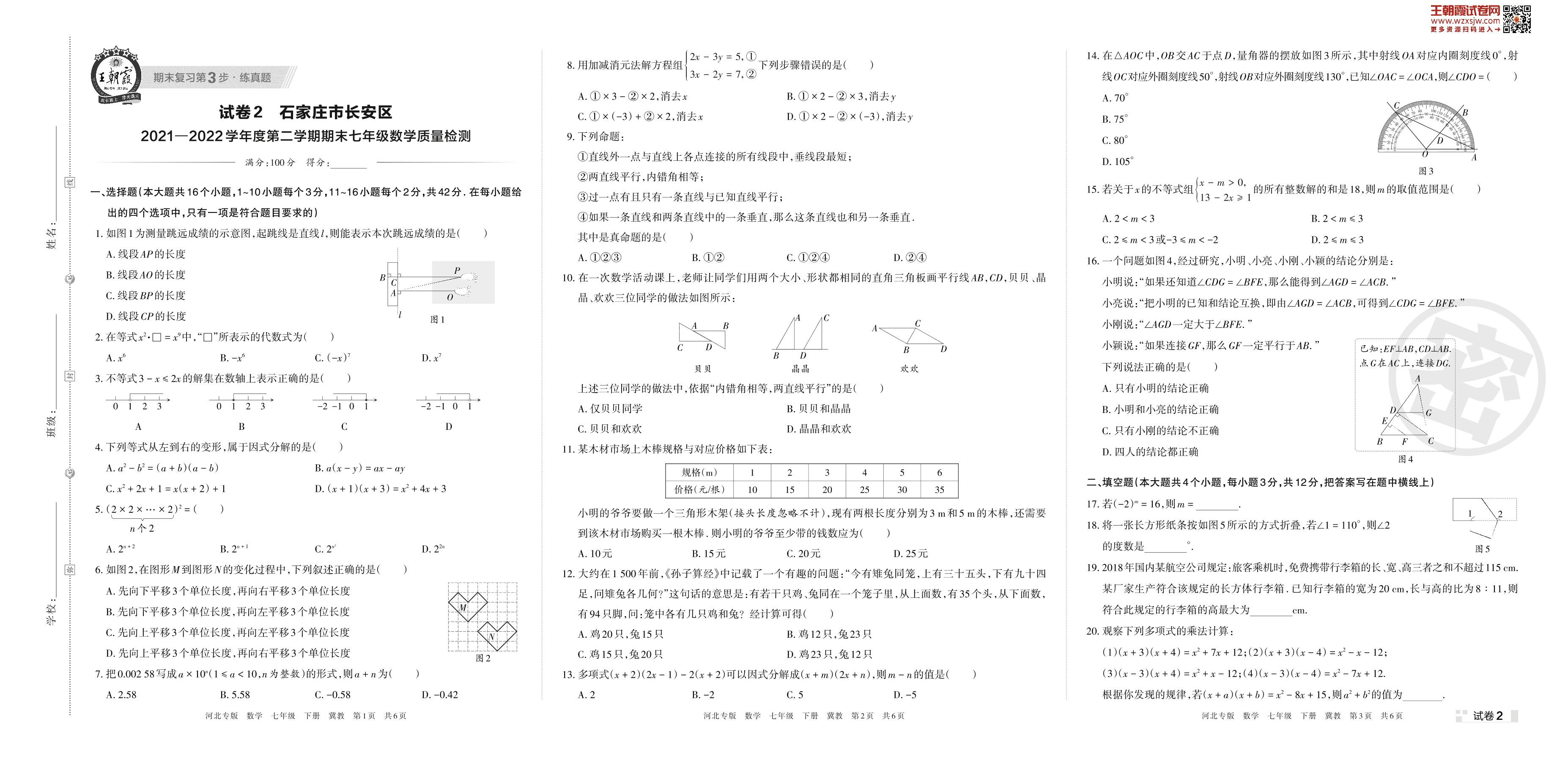 石家庄市长安区2021—2022学年度第二学期期末七年级数学质量检测(冀教版)【2】