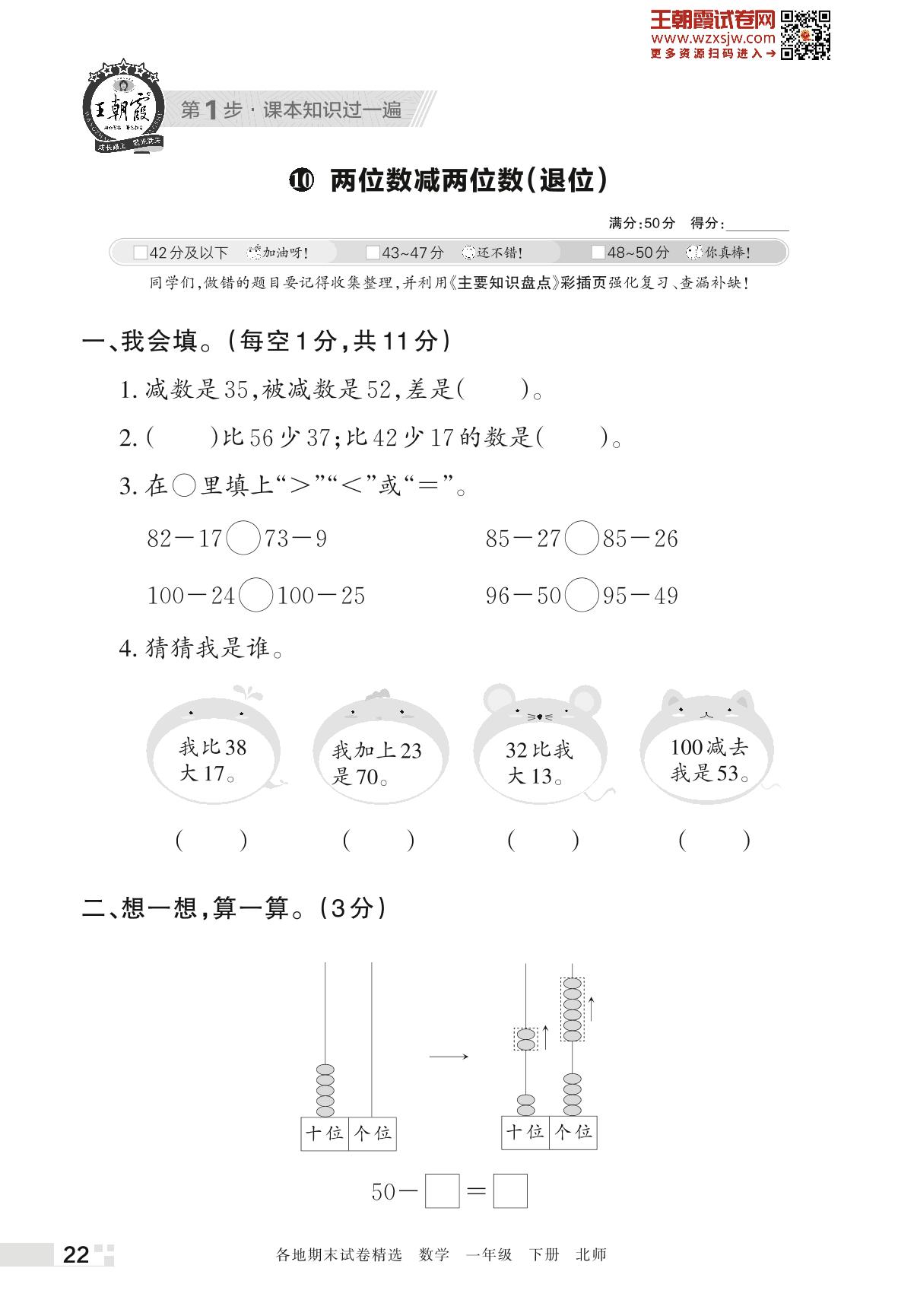 王朝霞期末过课本——10 两位数减两位数(退位)一年级下册数学(北师版)