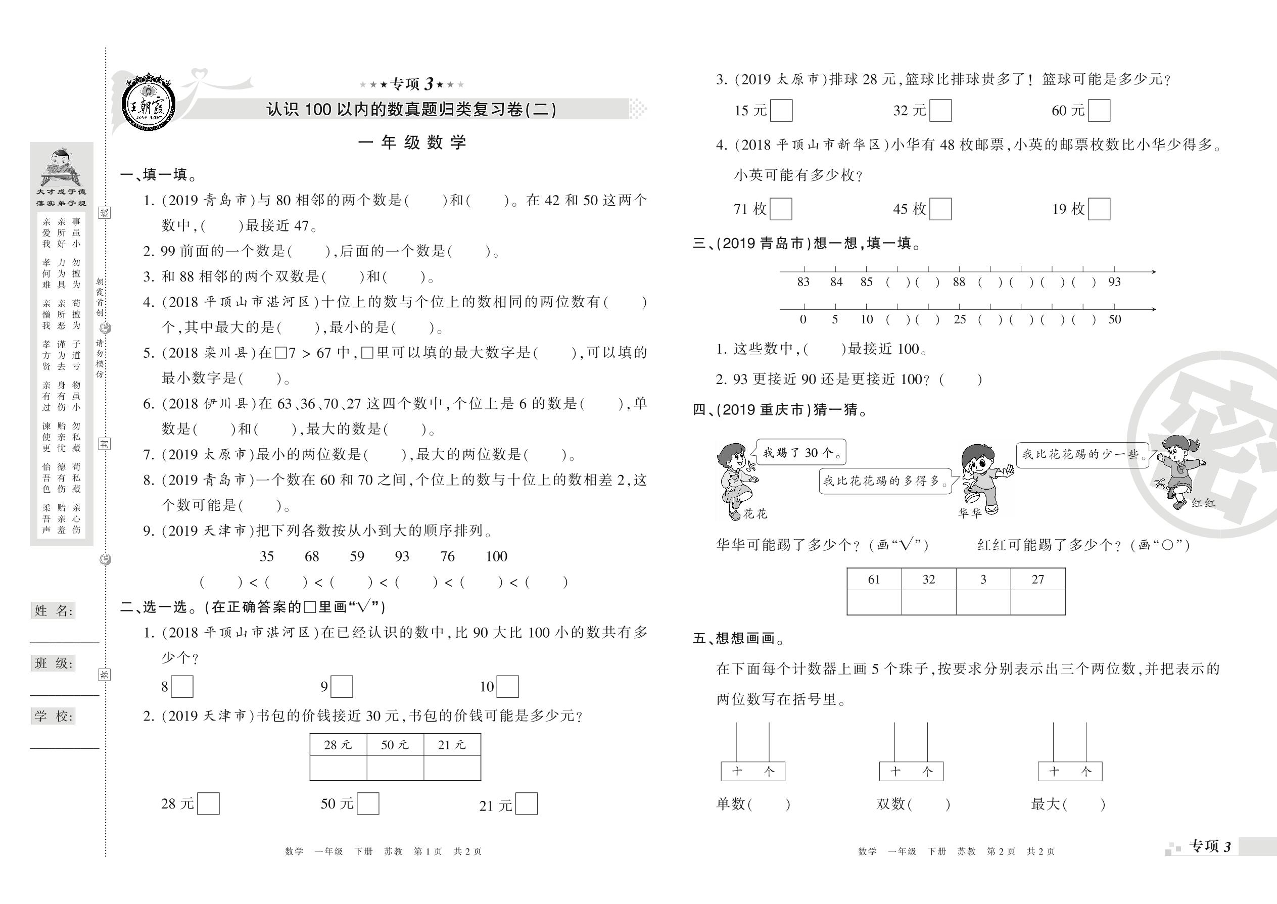 王朝霞期末专项卷——认识100以内的数(二)、元、角、分真题归类复习卷一年级下册数学(苏教版)【0】