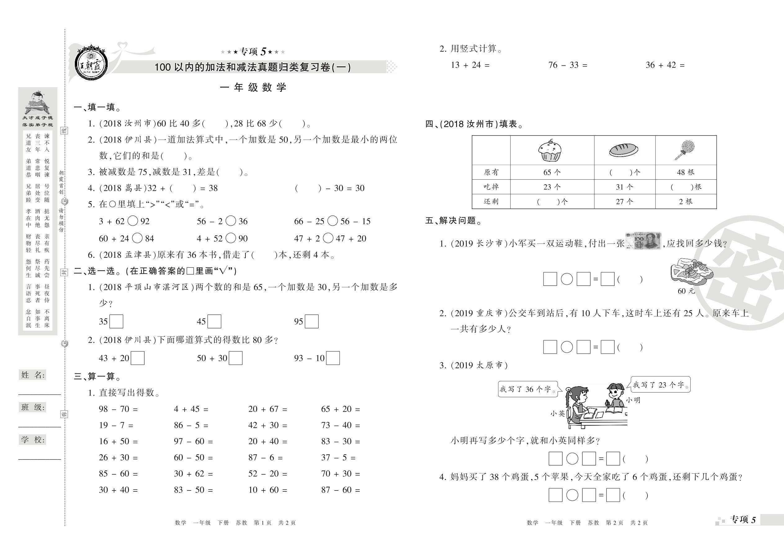 王朝霞期末专项卷——100以内的加法和减法(一)(二)真题归类复习卷一年级下册数学(苏教版)【0】