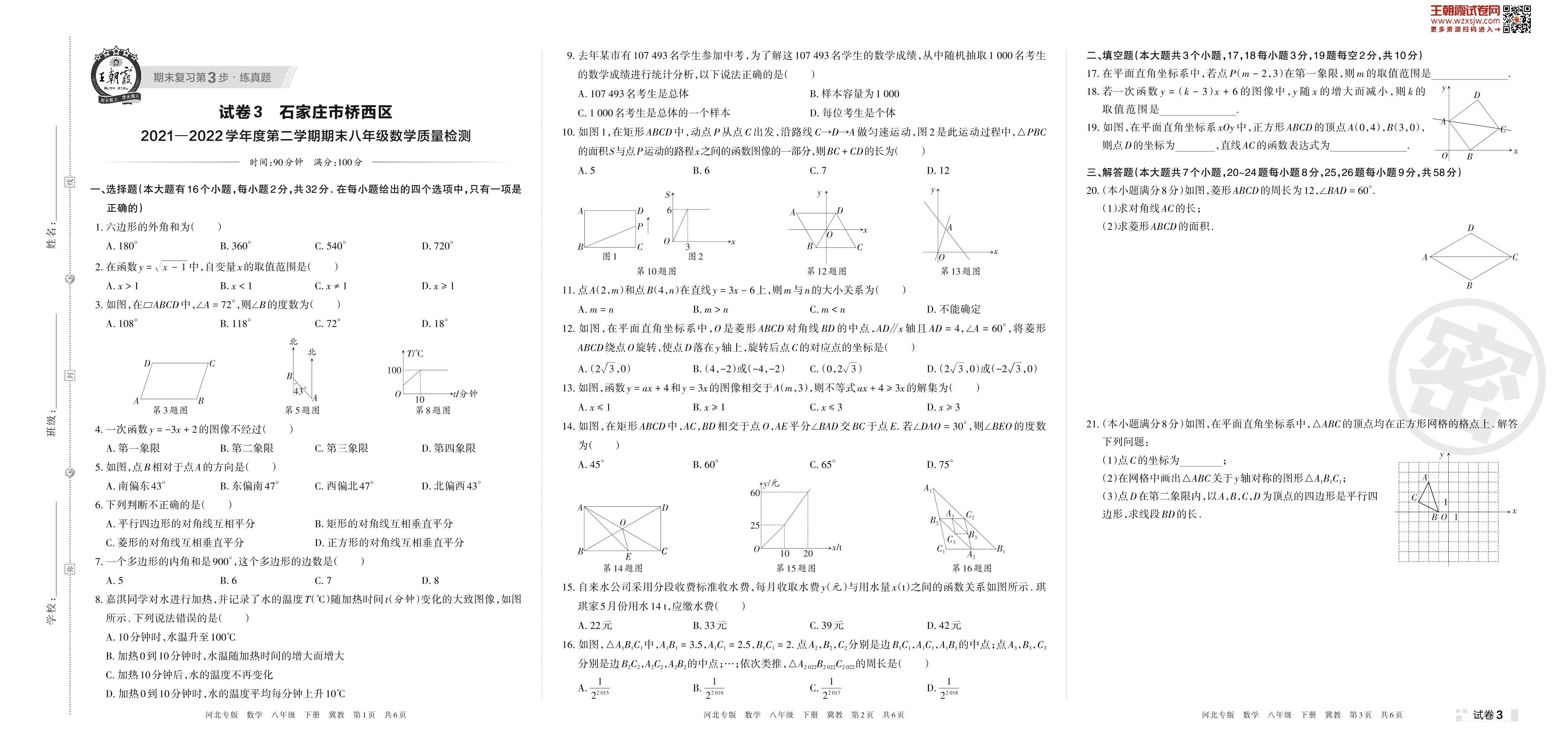 石家庄市桥西区2021—2022学年度第二学期期末八年级数学质量检测(冀教版)【3】