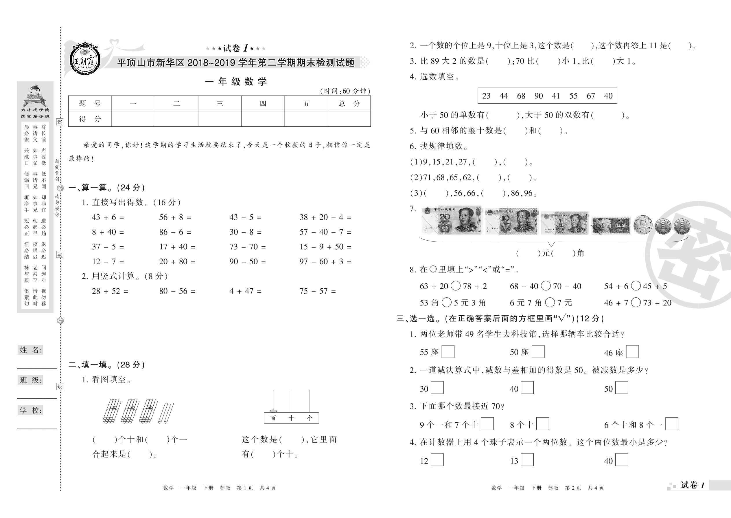 2018-2019学年第二学期平顶山市新华区一年级数学试卷(苏教版)_R210802214213【1】