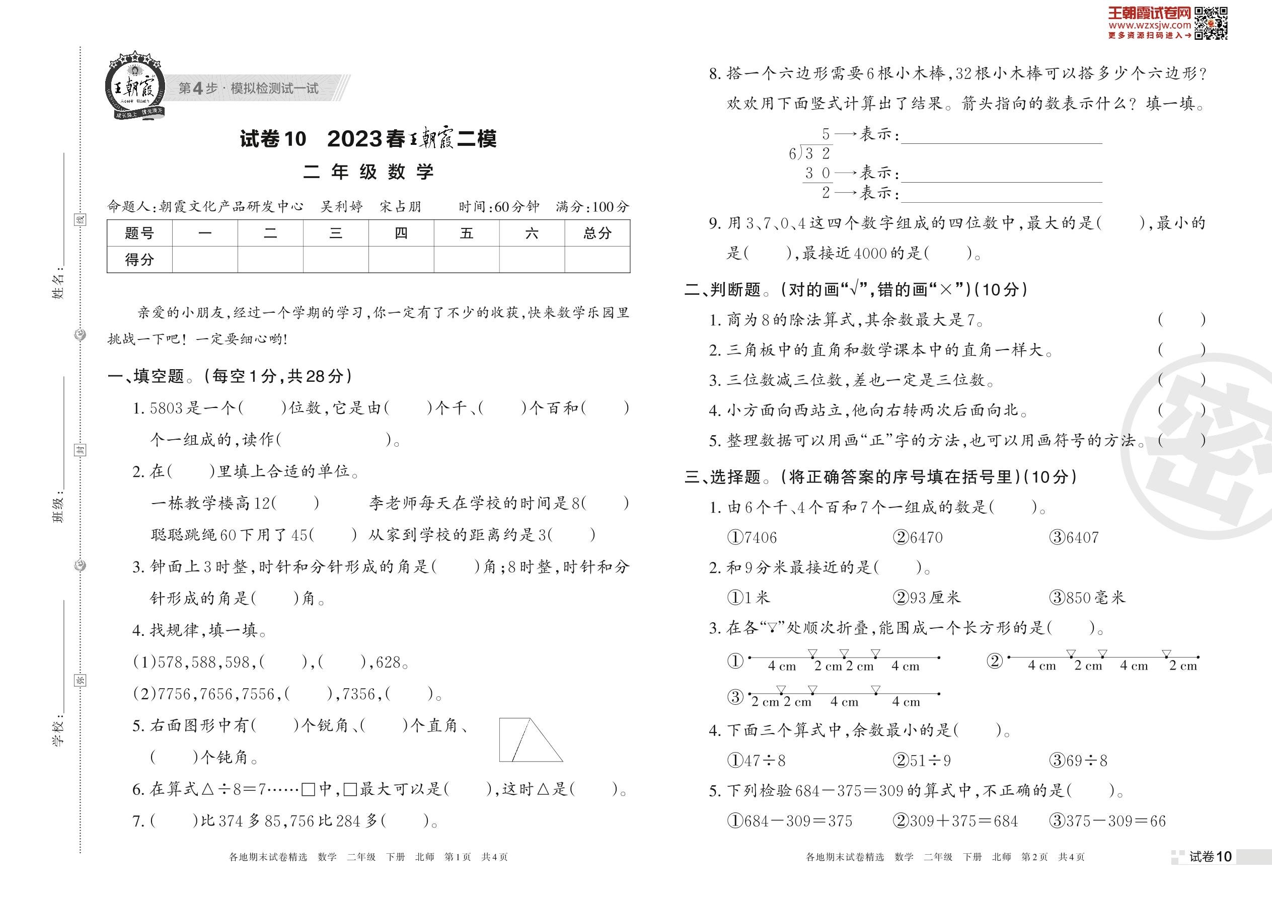 王朝霞期末模拟卷二年级下册数学(北师版)【10】