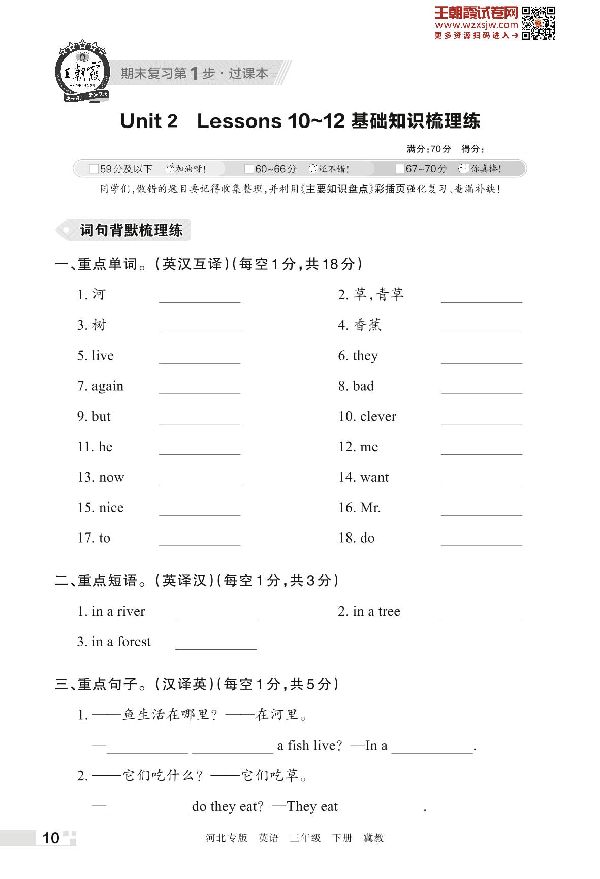 王朝霞期末过课本——Unit 2 Lessons 10~12 基础知识梳理练三年级下册英语(冀教版)
