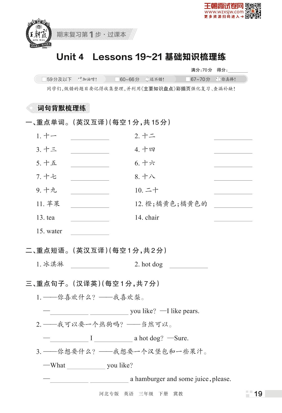 王朝霞期末过课本——Unit 4 Lessons 19~21 基础知识梳理练三年级下册英语(冀教版)