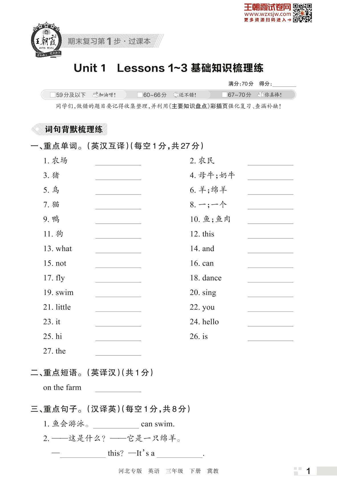 王朝霞期末过课本——Unit 1 Lessons 1~3 基础知识梳理练三年级下册英语(冀教版)