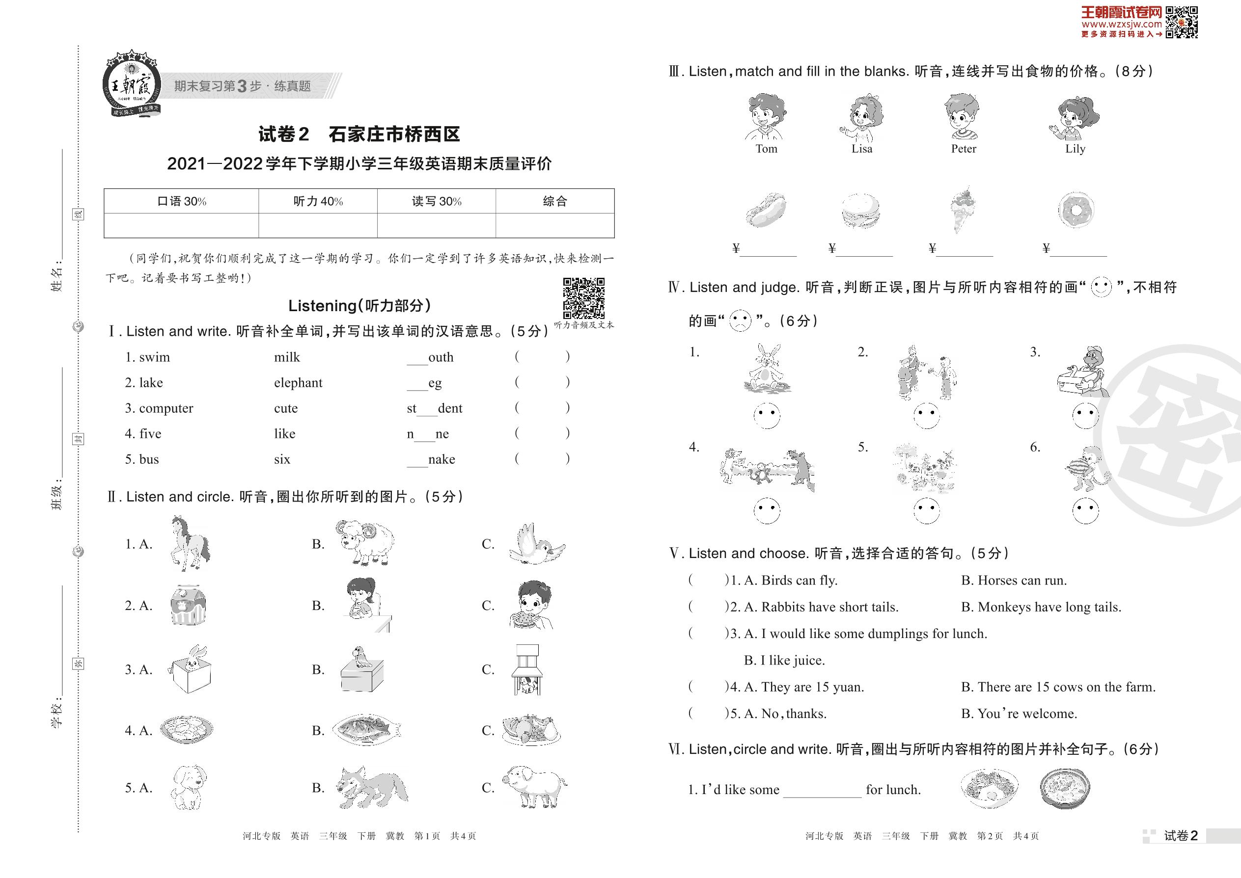 石家庄市桥西区2021—2022学年下学期小学三年级英语期末质量评价(冀教版)【2】