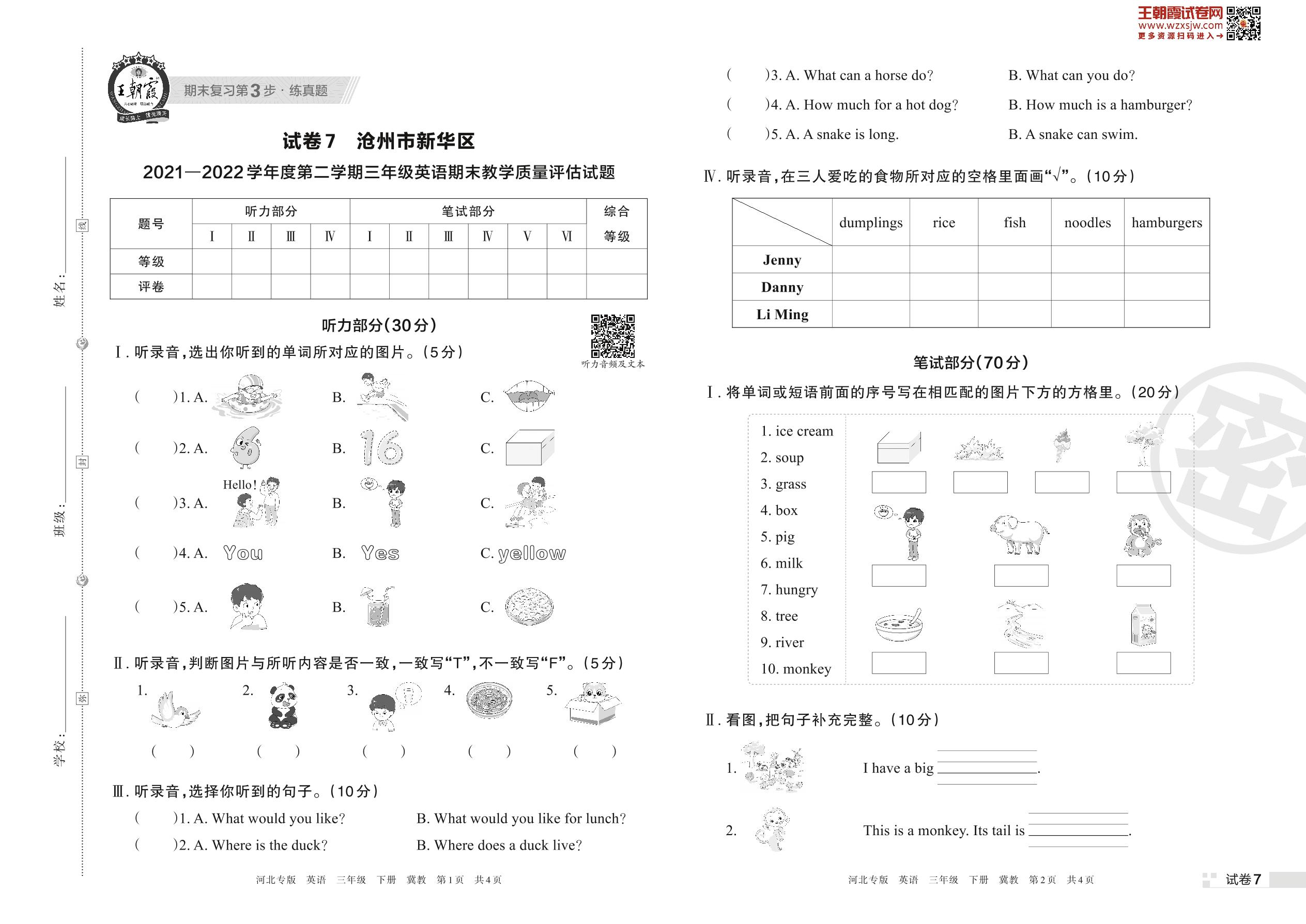 沧州市新华区2021—2022学年度第二学期三年级英语期末教学质量评估试题(冀教版)【7】